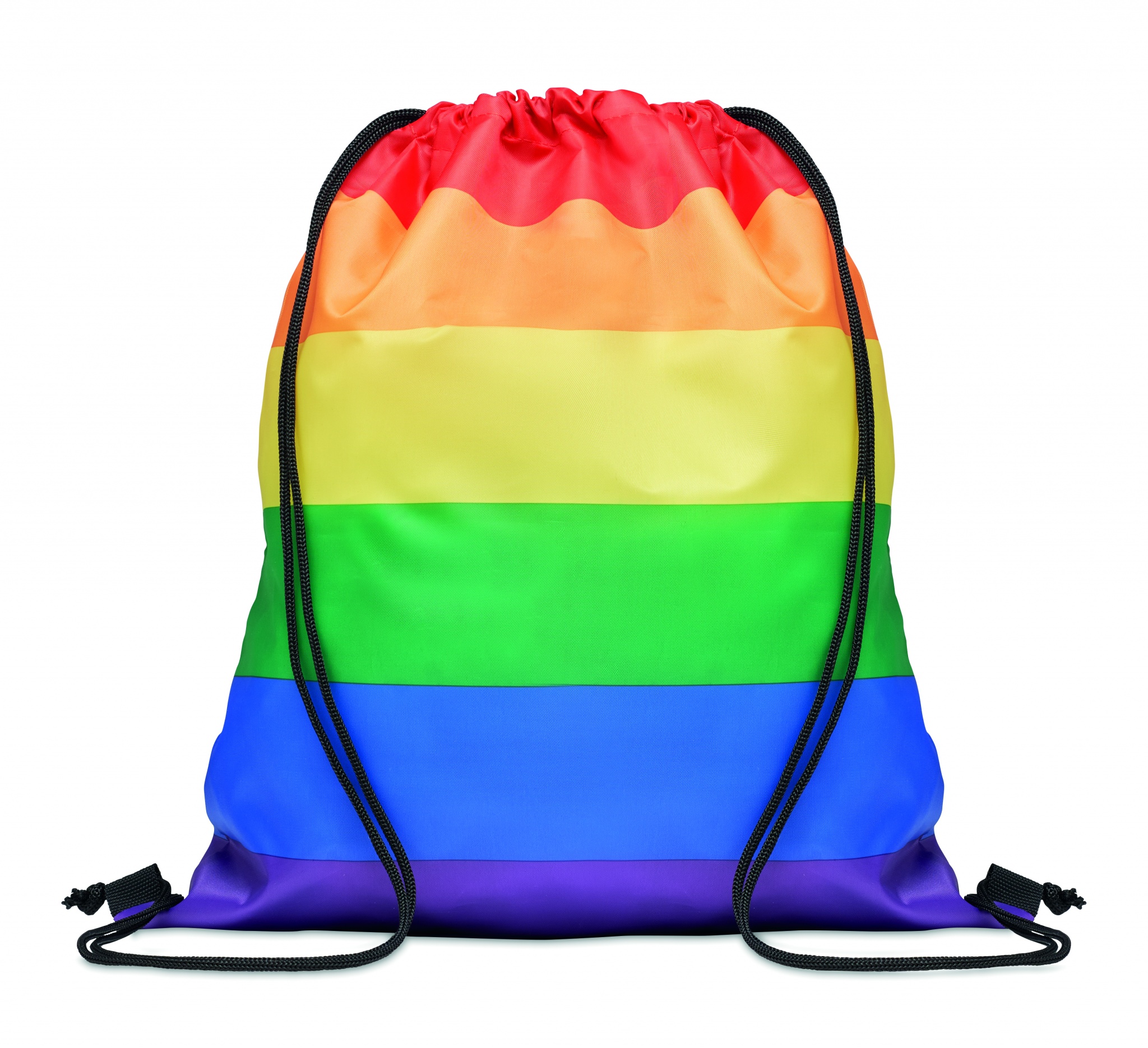 Beutel mit Kordelzug aus 210D RPET-Polyester mit Kordeln aus PP. In Regenbogenfarben.
