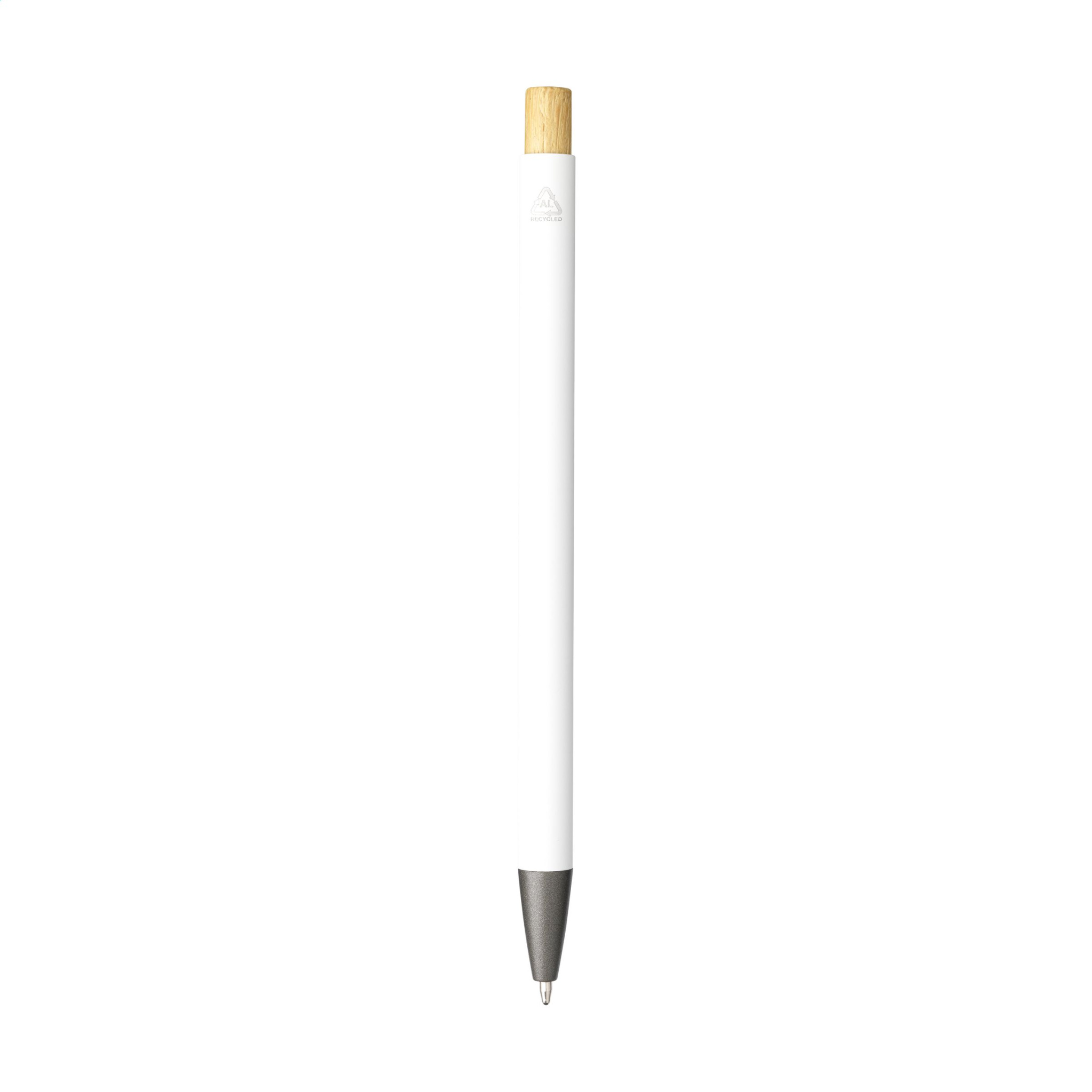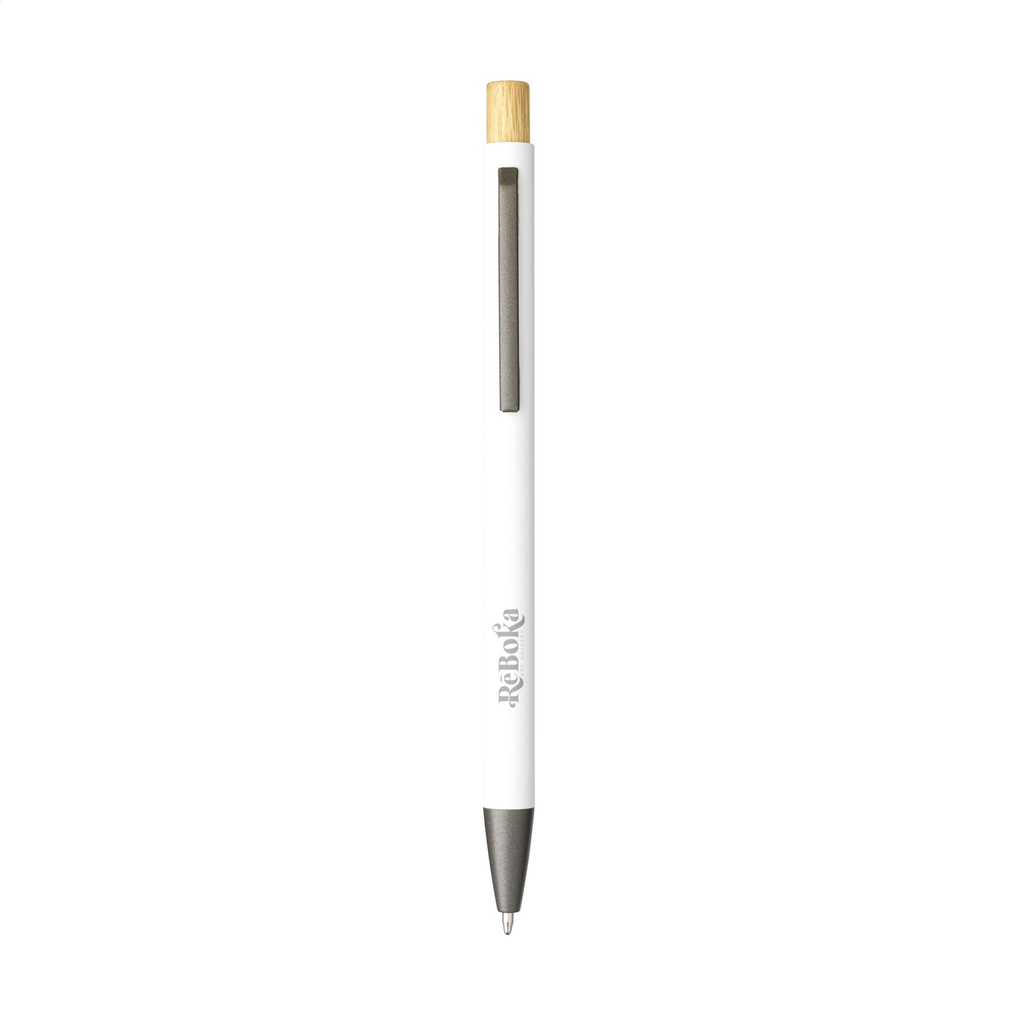 WoW! Blauschreibender, schlanker Kugelschreiber mit Schaft aus recyceltem Aluminium mit gummierter Oberfläche. Metallclip. Schlankes Design. Der Bambus-Druckknopf verleiht dem Stift eine natürliche Note. GRS-zertifiziert. Gesamtes recyceltes Material: 78 %. Durch die Verwendung von recyceltem Aluminium werden bei der Produktion weniger neue Rohstoffe verwendet. Dies bedeutet weniger Energieverbrauch und weniger Wasserverbrauch. Eine verantwortungsvolle Wahl.
