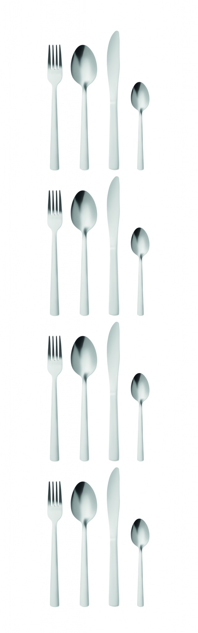 16 piece stainless steel cutlery set for 4 place settings. Including: tea spoon, table spoon, fork, knife. Presented in a kraft paper box.