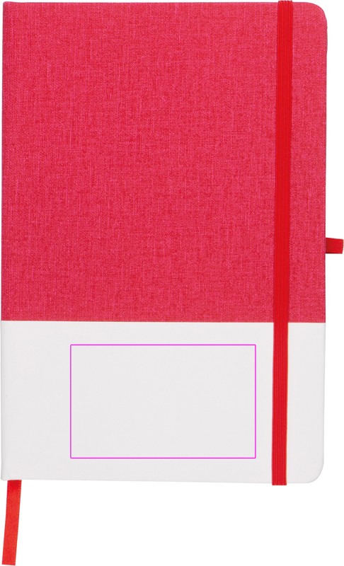 A5 notebook with 160 squared pages, PU fabric cover, bookmark, ballpen loop, and elastic rubber closure band. We print your logo on the white surface.