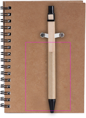 Recycled cardboard notepad with 120 pages of recycled paper and a blue ink ballpoint pen. We will print your logo on the cover.