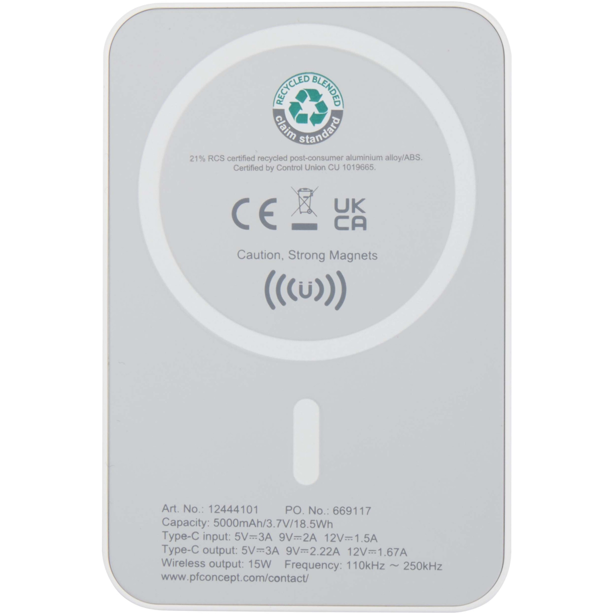 Logo trade promotional items picture of: Acrab 5000 mAh 15W magnetic wireless power bank with 20W PD - made from recycled plastic