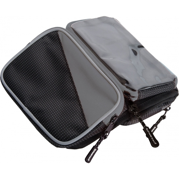 Compact Schwarzwolf bicycle bag with a phone pocket. The bag has two side pockets with a zipper and a transparent detachable phone pocket. Inside dimensions of the bag: 8 x 16.5 x 2 cm. Packed in a Schwarzwolf box.