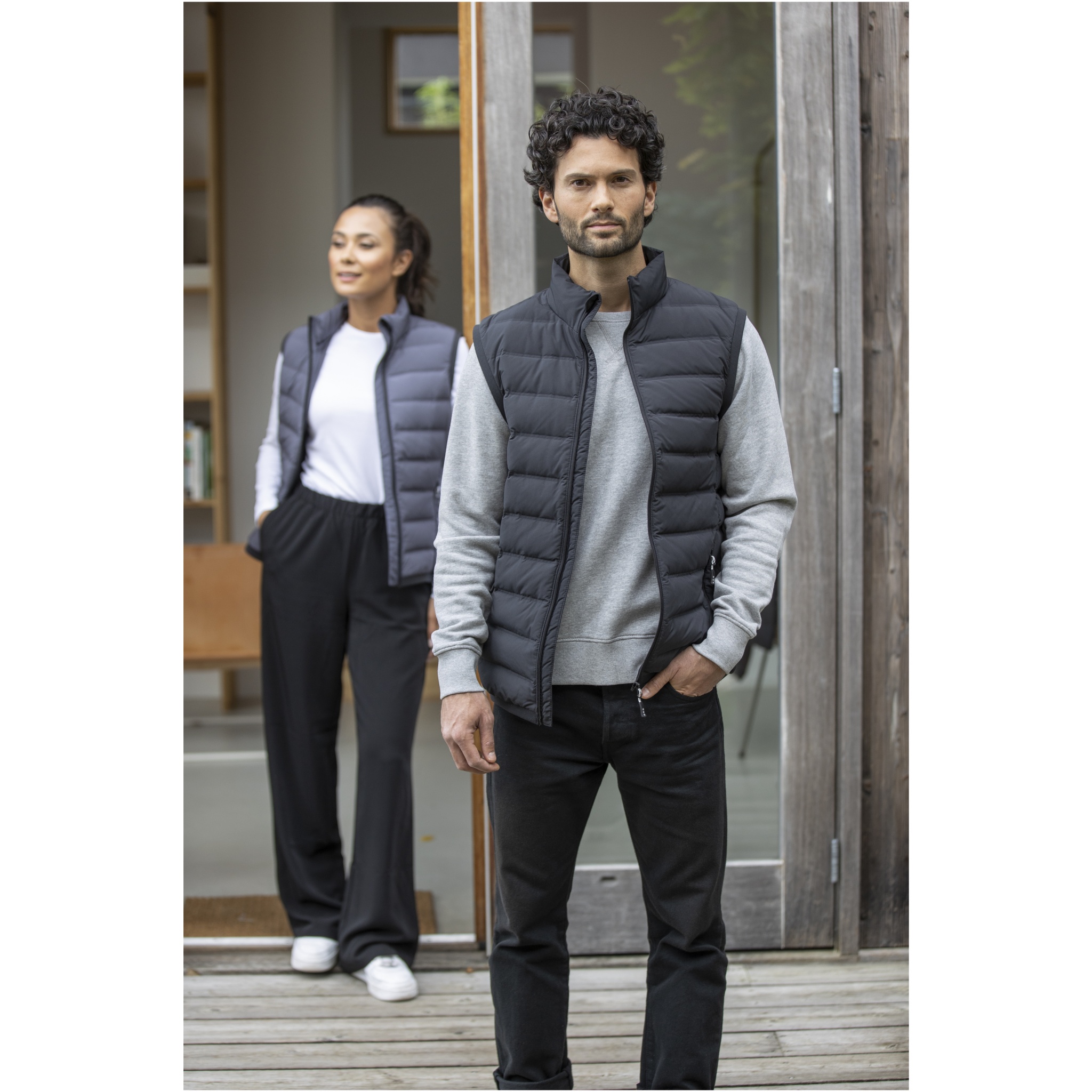 The Caltha men's insulated down bodywarmer – a versatile and eco-friendly outerwear piece. Made of 164 g/m² 750T woven double layer pongee fabric in polyester. The matte fabric in combination with heat seal quilting gives the bodywarmer a modern look while enhancing the overall insulation. Embrace eco-consciousness with RDS certified recycled down insulation of recycled down and recycled feathers, providing warmth without compromising on ethical standards. With an inner storm flap, chinguard, and flat knit elasticated rib cuffs, this bodywarmer offers maximum protection against the elements. The front pockets with zipper closure add convenience and functionality. Embrace both style and ethical values with the Caltha bodywarmer, perfect for any outdoor adventure or daily wear.