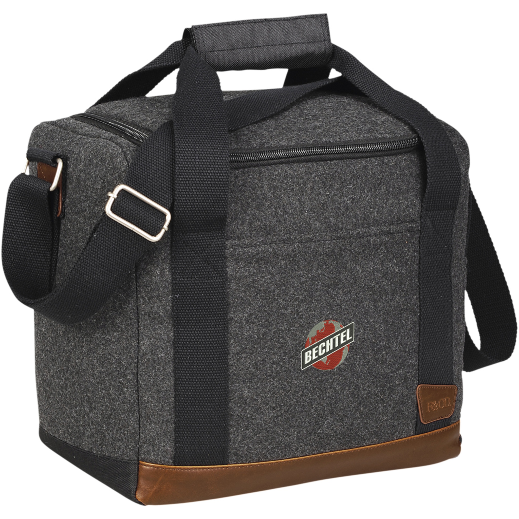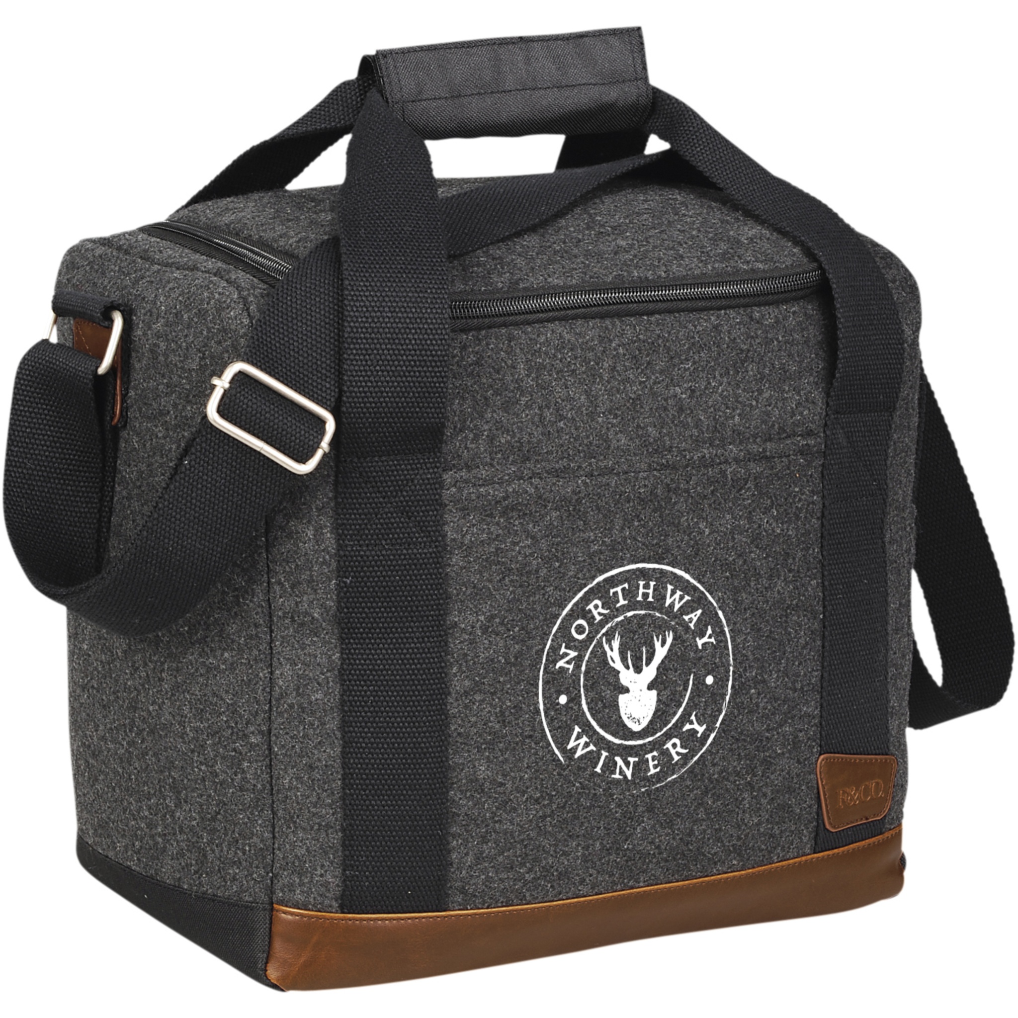 Part of the Field & Co.® Campster Series. Inspiration was drawn from retro camping and old school scout looks combined with modern needs. This stylish cooler bag combines wool/poly material and vinyl accents with the function of an insulated cooler with bottle divider. Die cut inserts slip together and create individual compartments for twelve individual 350ml bottles. When not in use they collapse and can be stored in the base of the bag. Includes a Field & Co.® branded bottle opener.