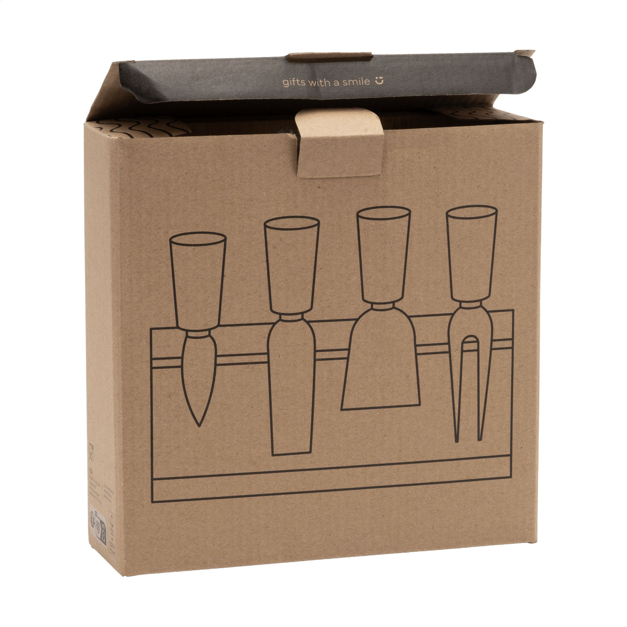 Cheese board made from FSC 100% certified bamboo. With knife holder equipped with a magnetic strip. Incl. 3 cheese knives and 1 cheese stick. NOTE: Due to the natural grains and contours of bamboo, we cannot guarantee consistency in depth/colour of the engraving. Items supplied as a set with, each set individually boxed.