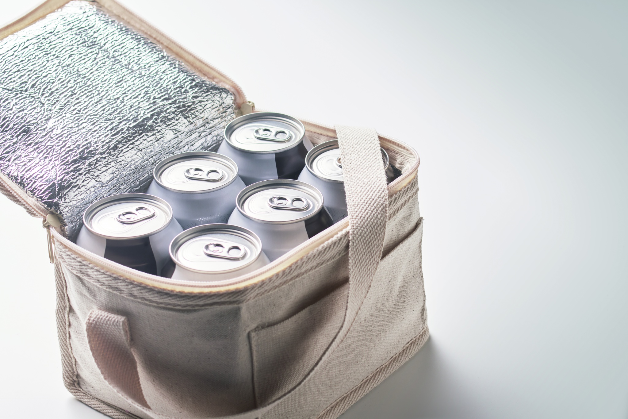 Cotton 280 gr/m² cooler bag with front pocket. 3 mm insulation aluminium laminated foil. Capacity: 3 L.