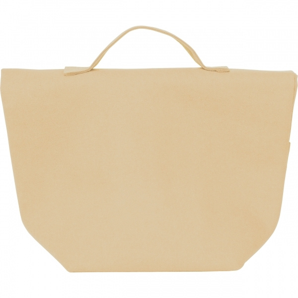 Cooler bag made from recycled cotton and recycled polyester. The bag features a carrying handle, a wide hook-and-loop fastener for closure, and a front pocket. Your logo is printed on the front pocket.