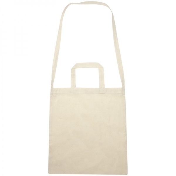 Nature-colored, environmentally friendly cotton bag with two short handles and one long carrying strap. We will print your logo on one side.