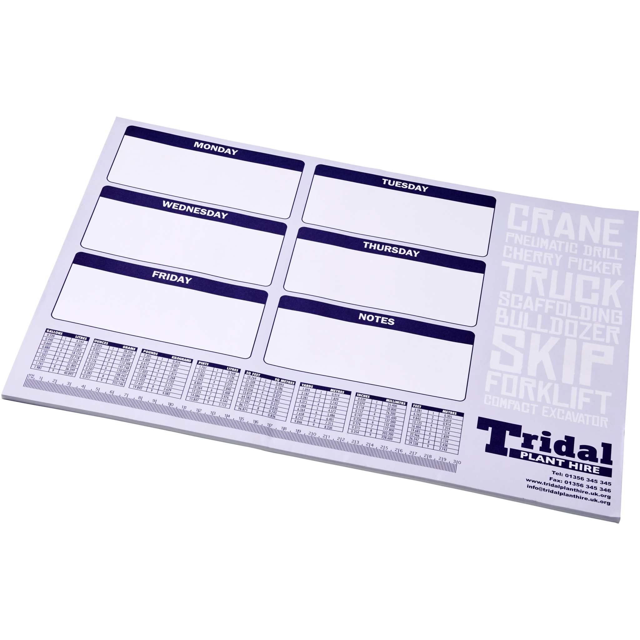 White A2 Desk-Mate® notepad with 80 g/m2 paper. Full colour print available to each sheet. Available in 2 sizes (25/50 sheets).