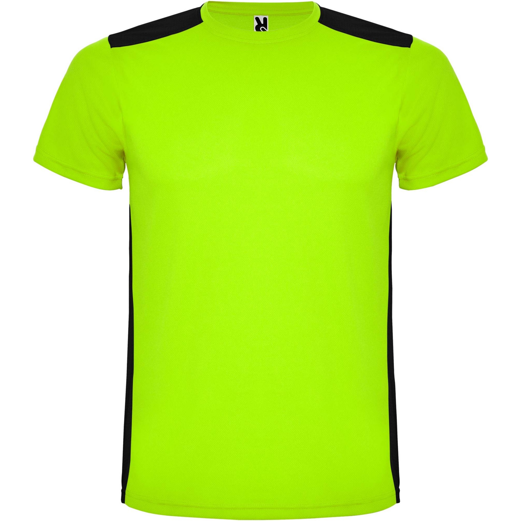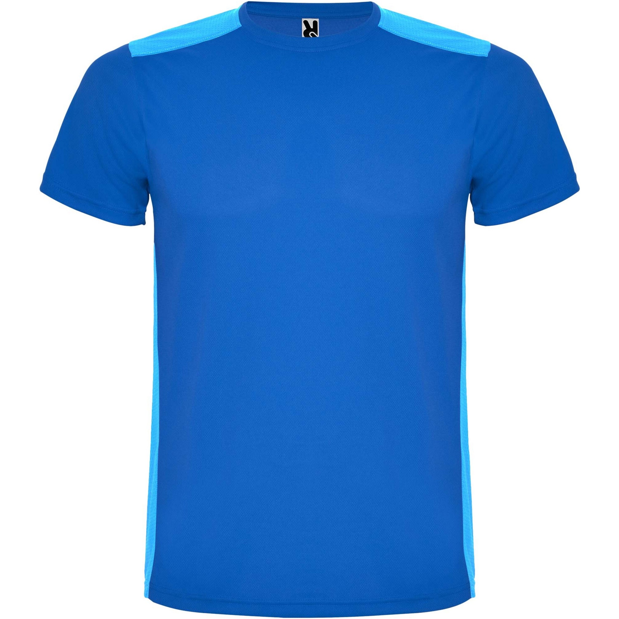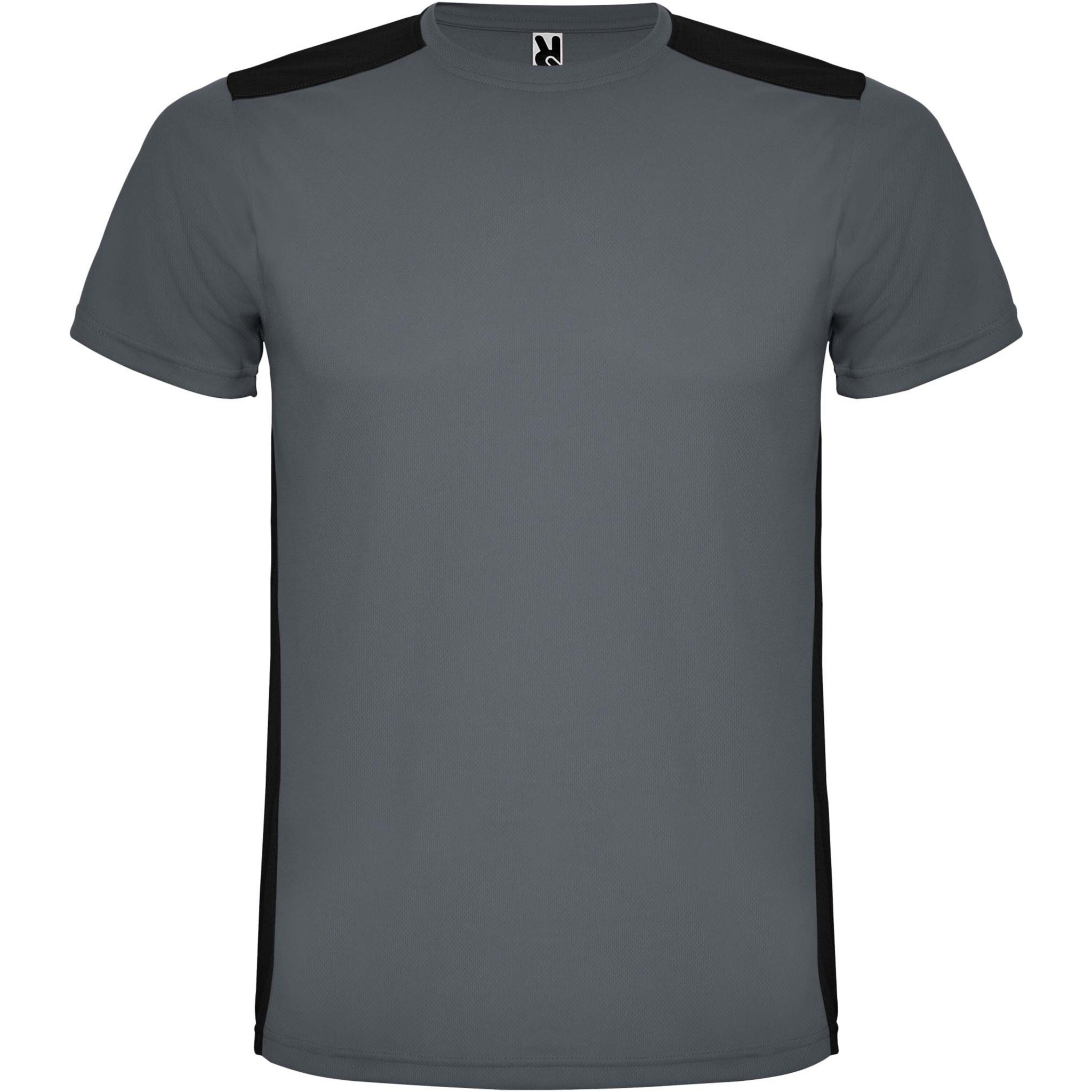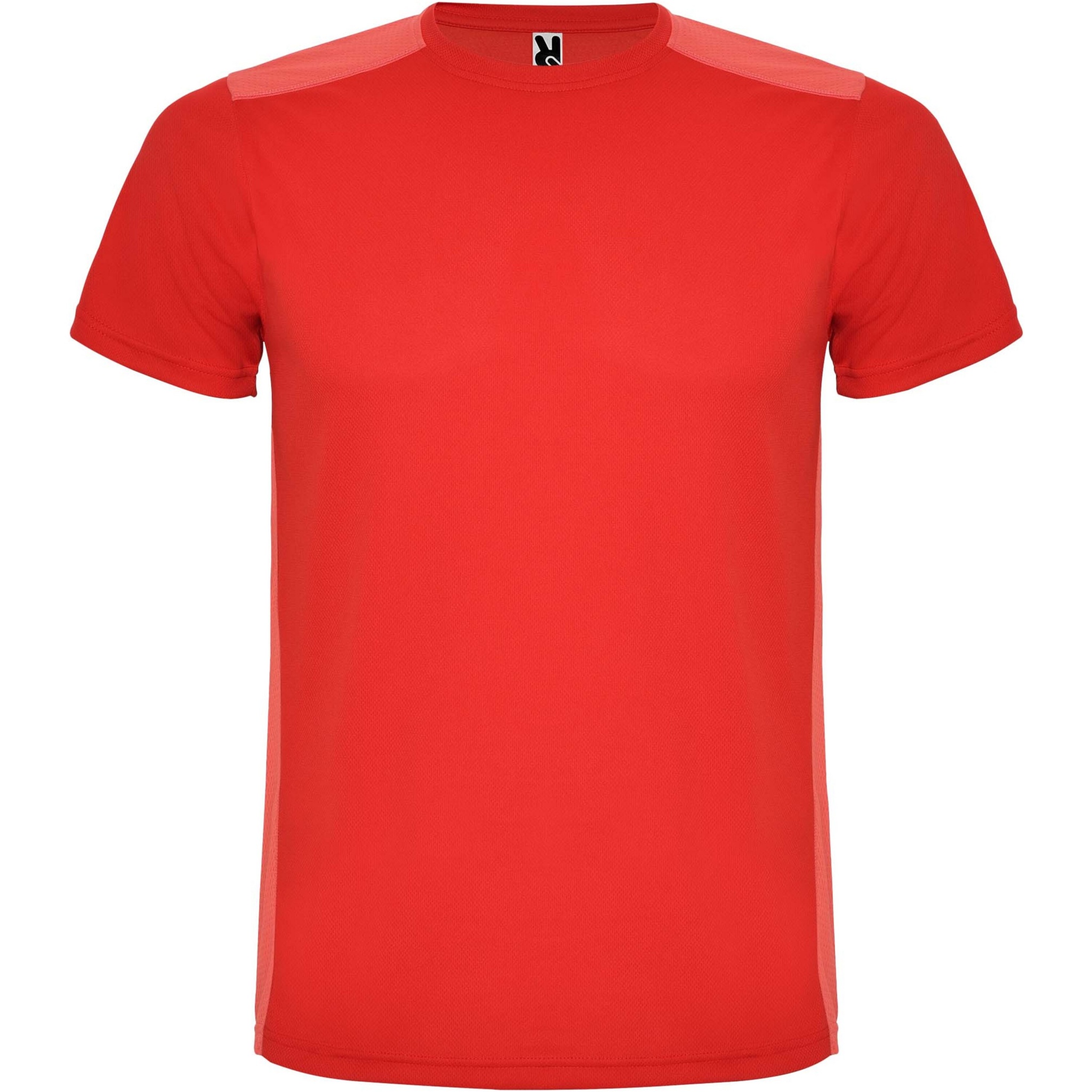 Easy-dry, technical and breathable fabric. Crew neck. Combination of two polyester fabrics on the back and shoulders. Bird's eye fabric on front and breathable 3D mesh fabric at the back. Fabric prepared for moisture absorption. Decorative zigzag backstitch on sides and shoulders. Back pattern slightly longer. Removable label.