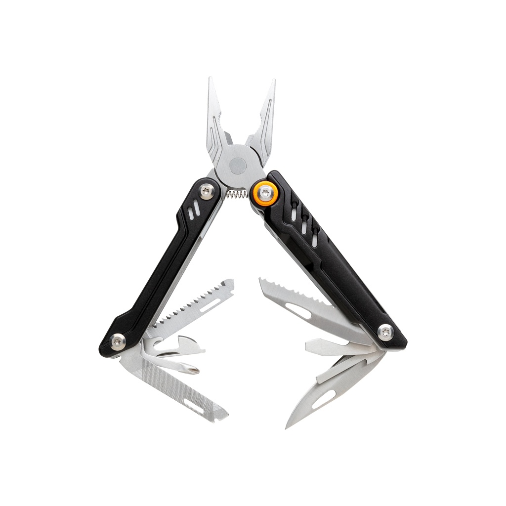Ultra-strong tool with 13 functions. Packed in luxury gift box including high quality 1680D pouch. Aluminium material body and stainless steel tools. Tools included: Long nose pliers, standard pliers, wire cutters, serrated blade, bottle opener, large flat screwdriver, medium flat screwdriver, knife, file, phillips screwdriver, can opener,  small flat screwdriver, saw.