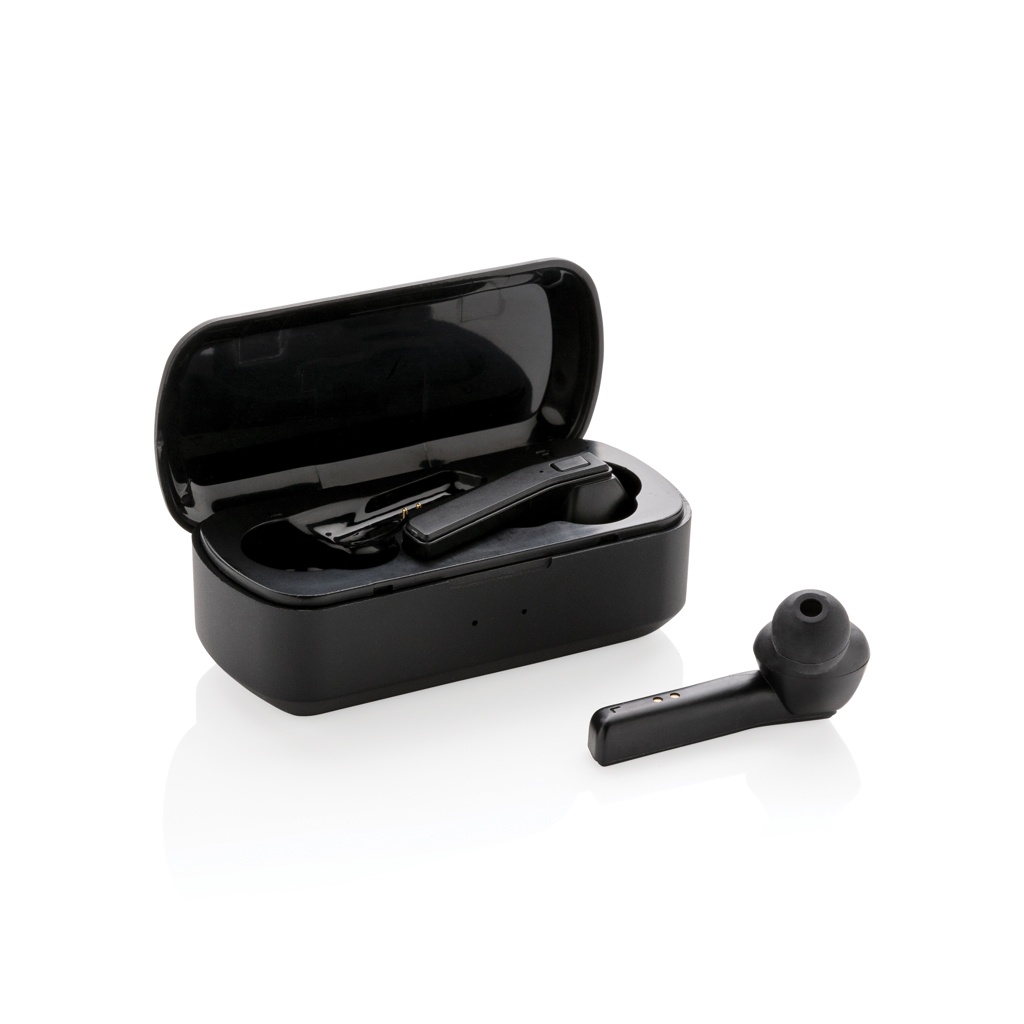 Let the music flow with these true wireless earbuds in charging case. The earbuds have a 35 mAh battery and can be re-charged in the 500 mAh charging case within 1 hour. With auto pairing function so easy to pair to your mobile device. Playing time on medium volume about 3 hours. With BT 5.0 for optimal connection. Operating distance up to 10 metres. With pick up and mic. Including 3 size silicone ear tips. ABS material casing.