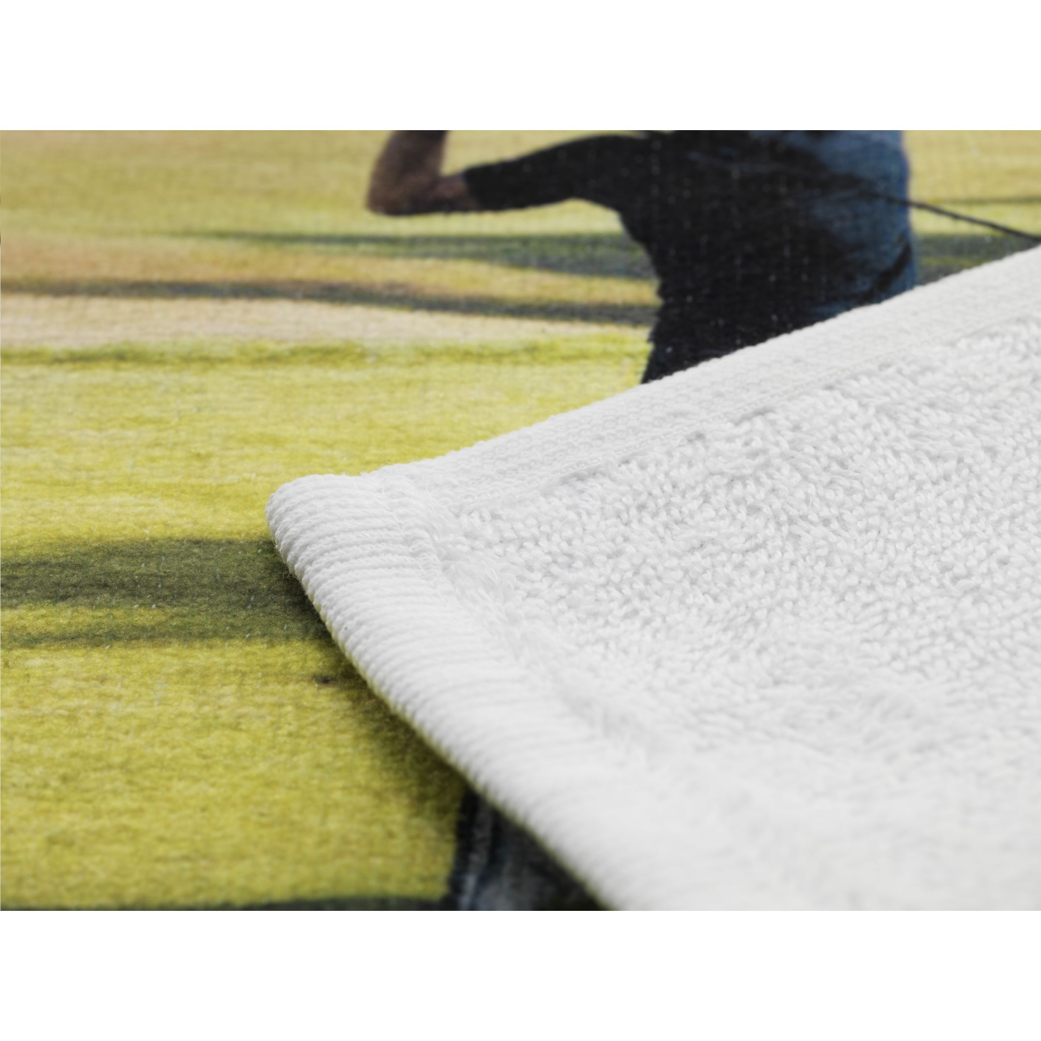 Golf towel including your own unique full colour print. Made from 40% microfibre and 60% cotton (400 g/m²). This quality golf towel features an eyelet with carabiner so that you can clip to your golf bag for easy access during your round of golf. This towel is lightweight and absorbs moisture quickly. Each piece packed in cellophane.