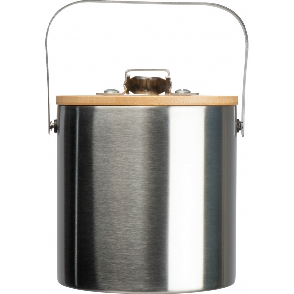 Double-walled stainless steel ice bucket with carrying handle, bamboo lid, gripper and a filling capacity of 1,200 ml. Your logo will be laser engraved on the bucket.