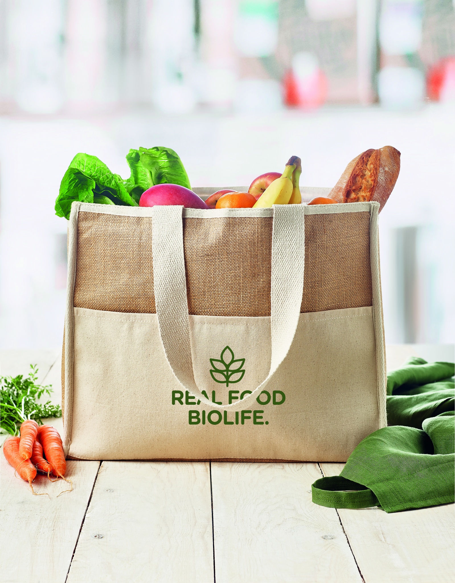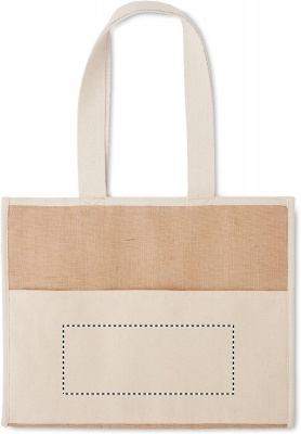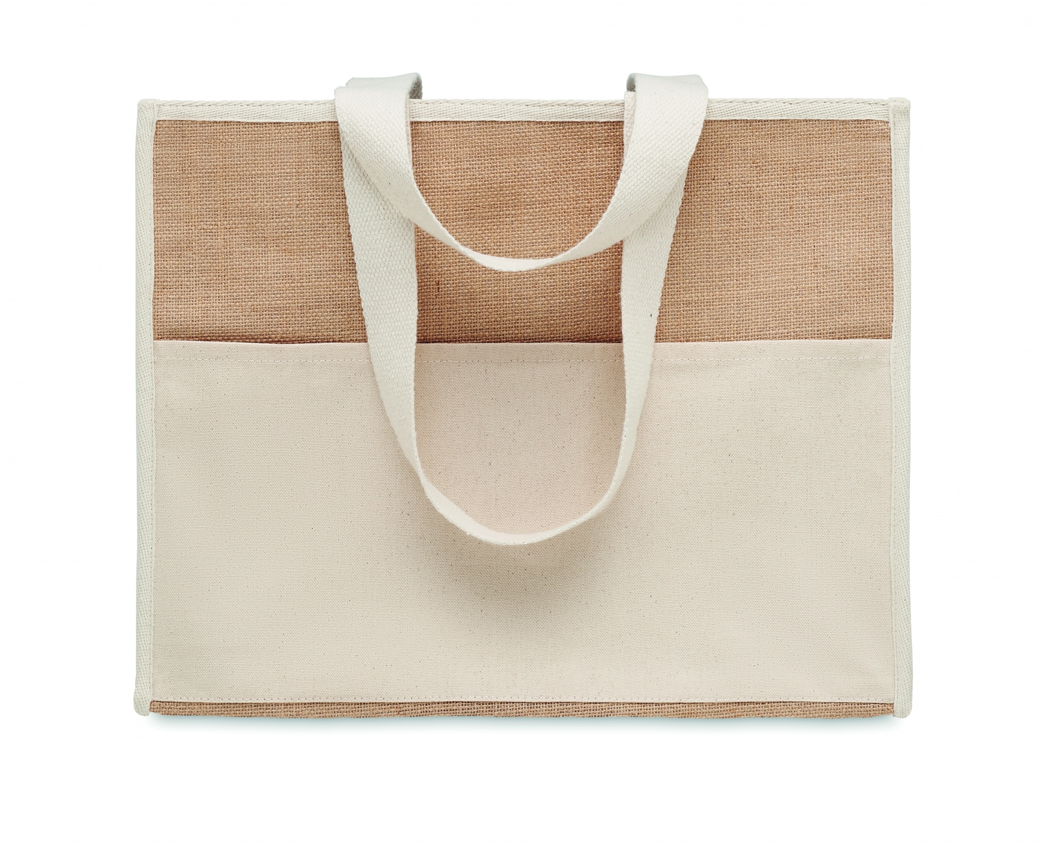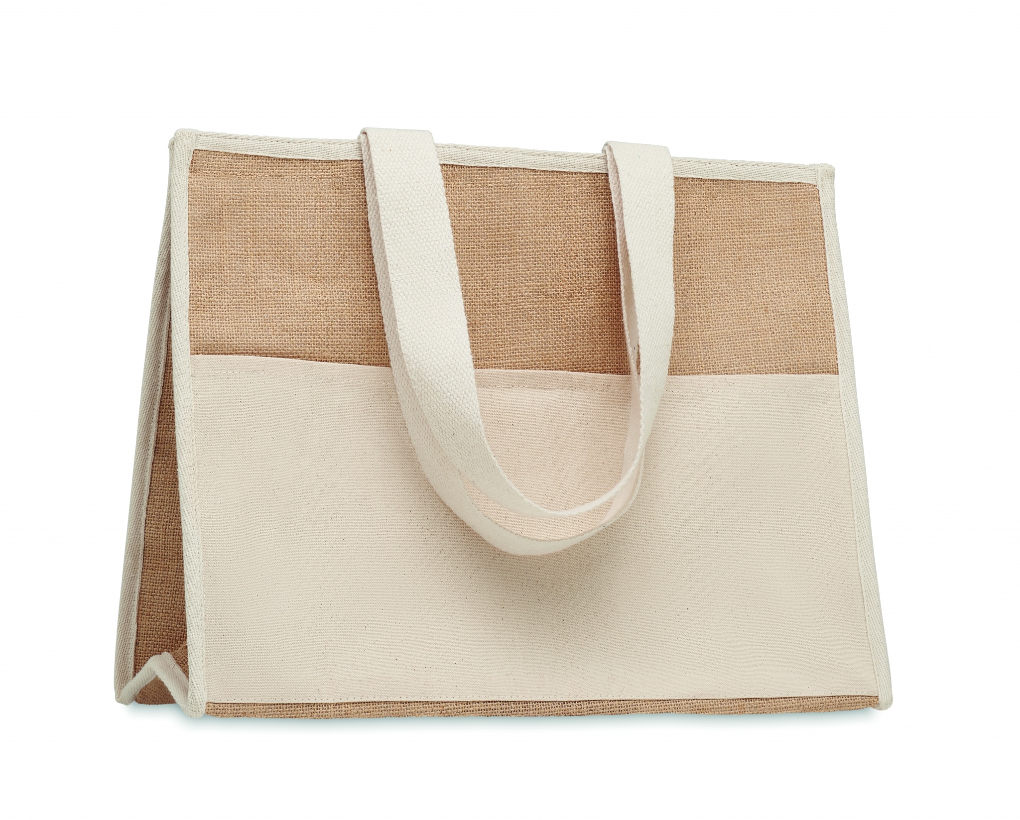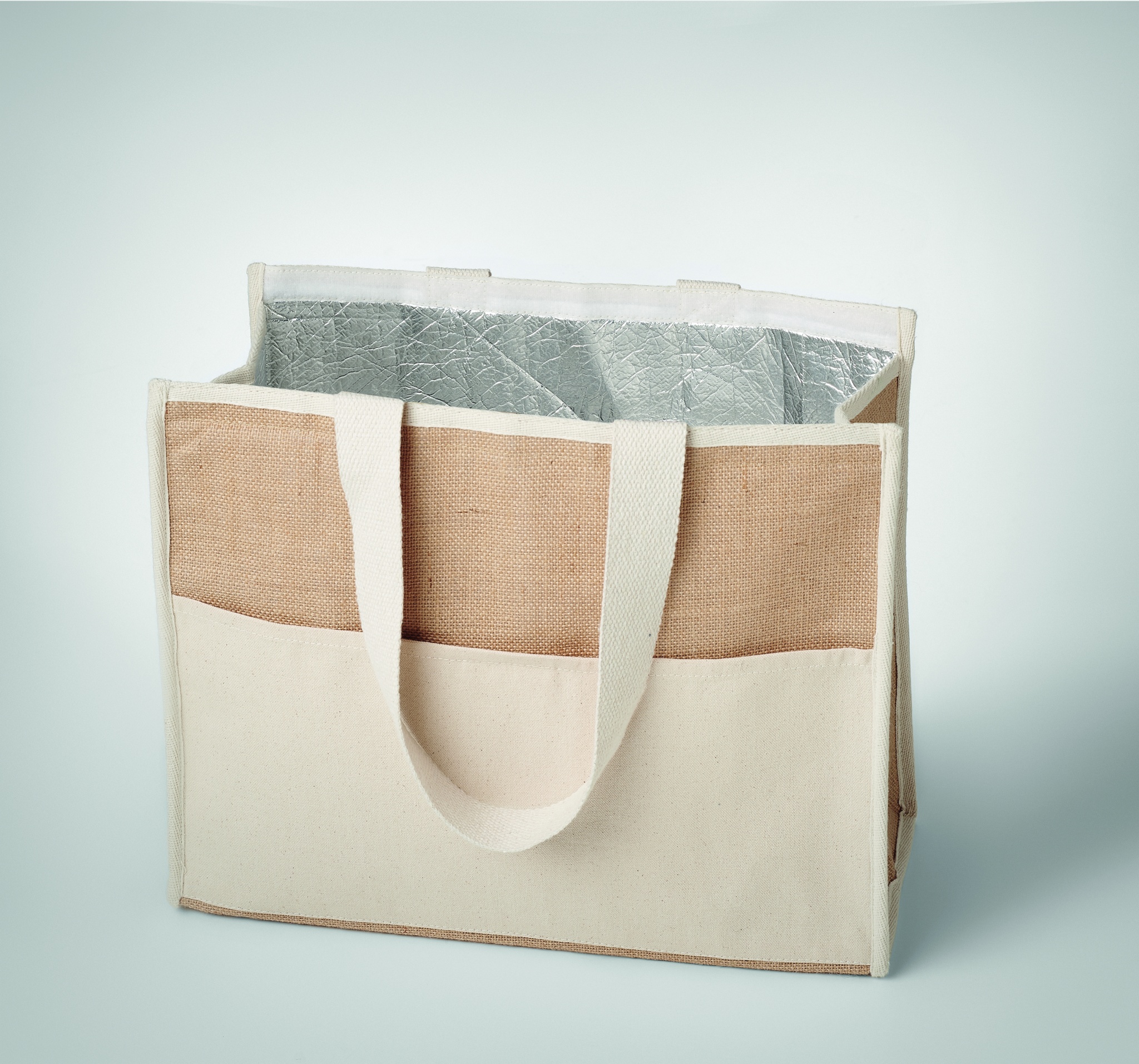 Jute shopping and cooler bag with long handles, laminated and with hook and loop closure, front with canvas pocket and cotton webbing.