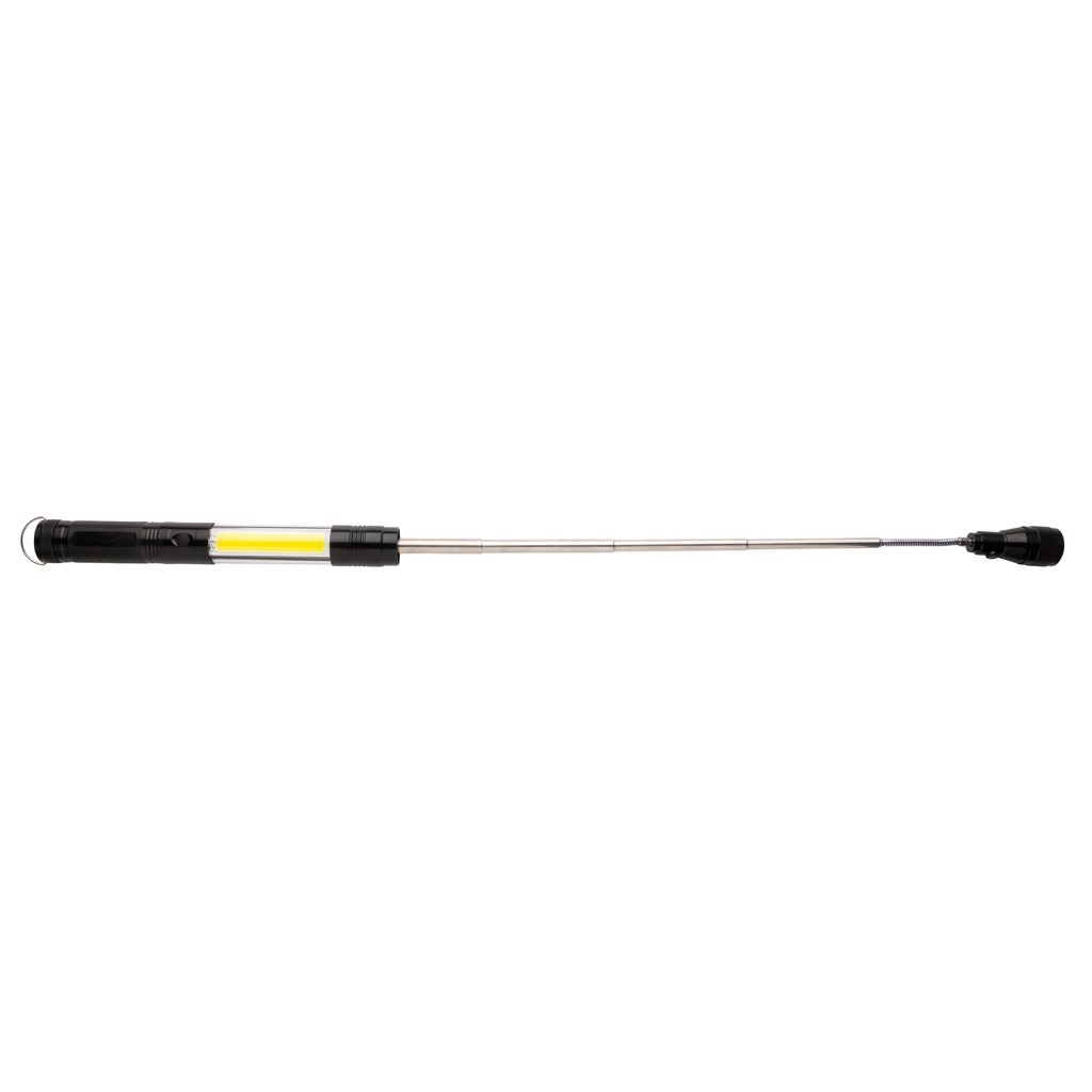 The perfect work light for any need, this double magnetic LED work light is great for attaching to any metal surface for optimal lighting. This aluminium flashlight allows you to extend from its normal size of 26 cm to 64 cm allowing you to pick up items that are stuck in hard to see and reach places with the magnet on front. This flashlight is equipped with three LED 10 l for extra bright exposure in dark spaces and 80 lumen COB light. When the head of the torch is extended, the head becomes flexible and can be adjusted in any direction. Includes batteries for direct use.