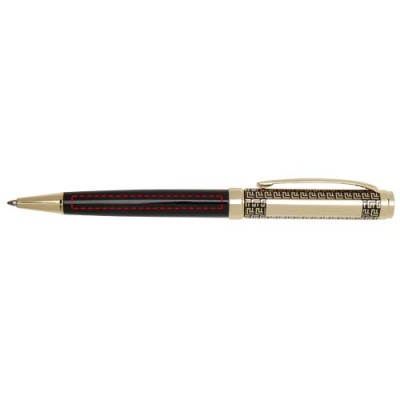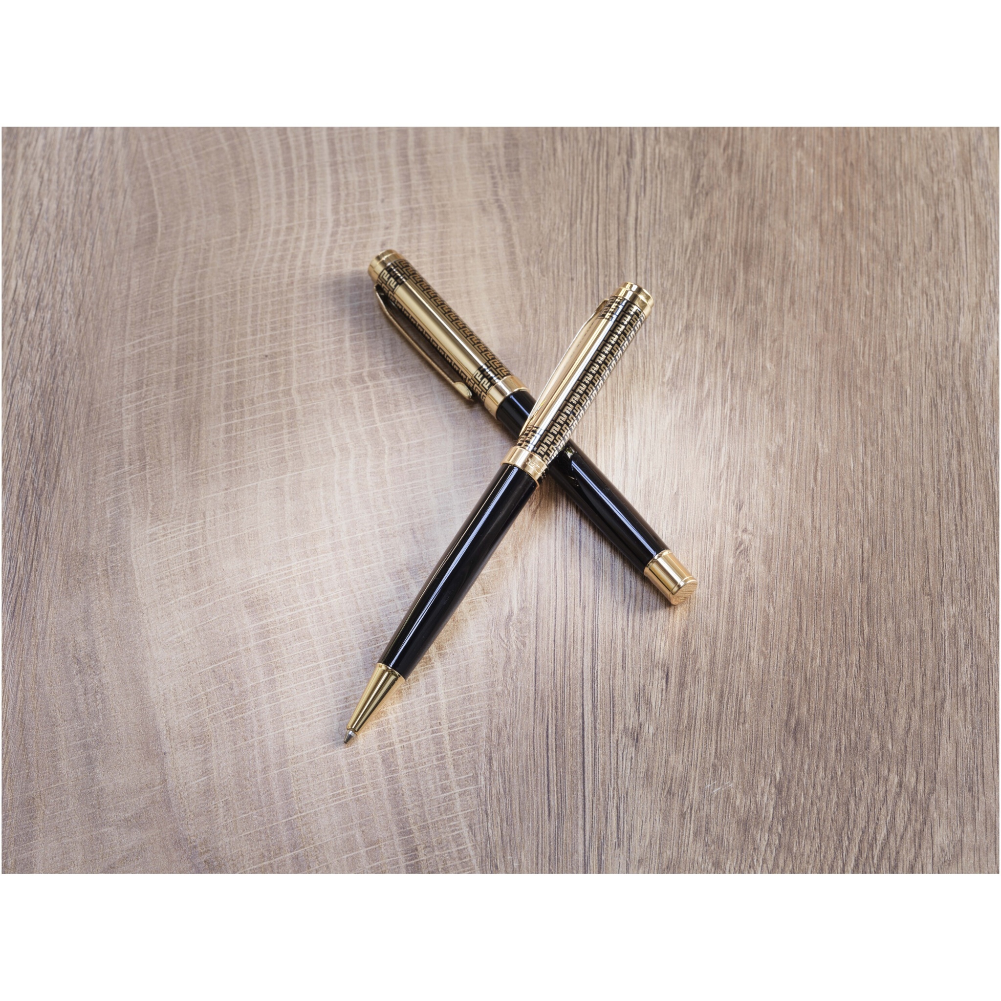 The Legato pen set is an elegant combination of a ballpoint pen and rollerball pen. Both pens have a recycled brass upper barrel with gold chromed finish, lower barrel with a black spray coating finish, metal gold chromed accessories, a LUXE logo on the mid ring, and blue ink. The ballpoint pen has a writing length of 800 metres, and 1.00 mm nib size. The rollerball pen has a writing length of 400 metres and 0.7 mm nib size.