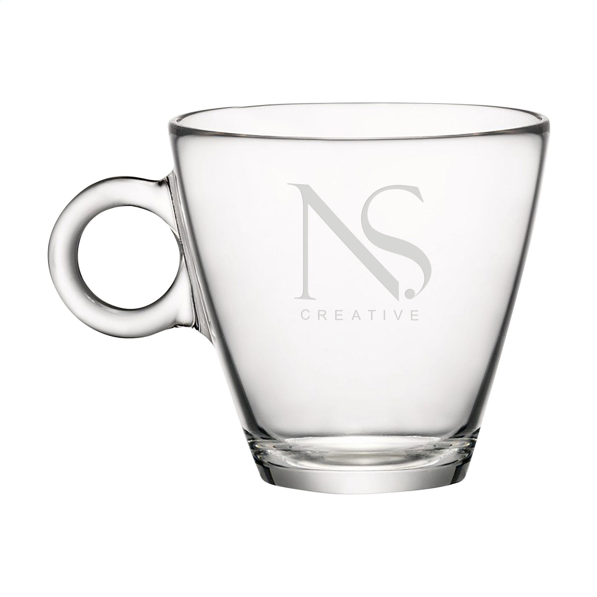 Espresso glass with a contemporary design. Made from high-quality, tempered glass. A timeless shape with a striking handle. Due to its shape and size, this glass fits perfectly in almost any coffee machine. Capacity 100 ml. Made in Italy.