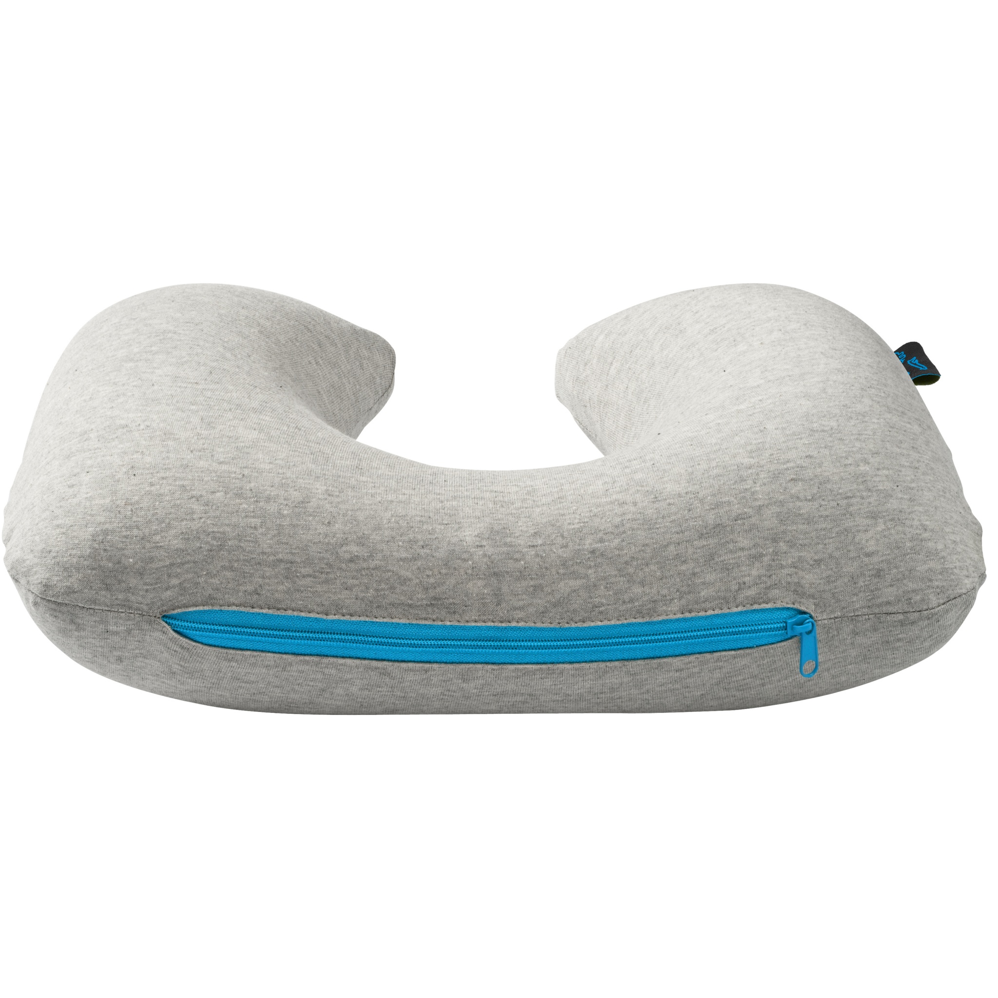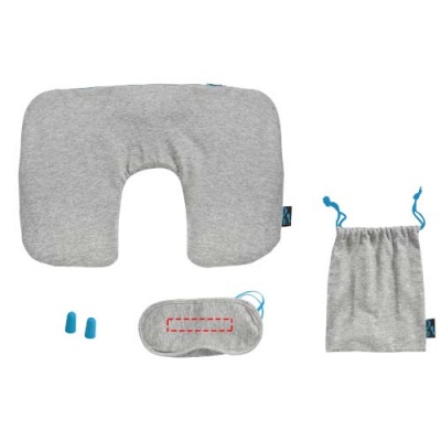 Soft travelset contains an inflatable neck pillow with bright blue zipper, eyemask with bright blue elastic, bright blue soft earplugs and a soft pouch with bright blue drawstring closure.