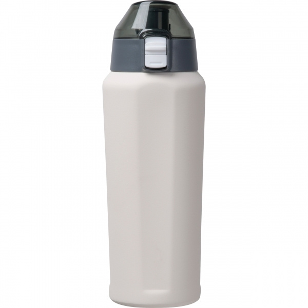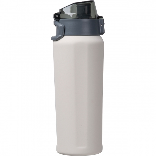 Stylish bottle made from recycled stainless steel, double-walled with vacuum insulation to keep beverages hot or cold for extended periods. It has a 600ml capacity and features a practical click lid for easy handling. Your logo will be centrally engraved with laser etching—perfect for branding. Functional, high-quality, and ideal for on-the-go use.