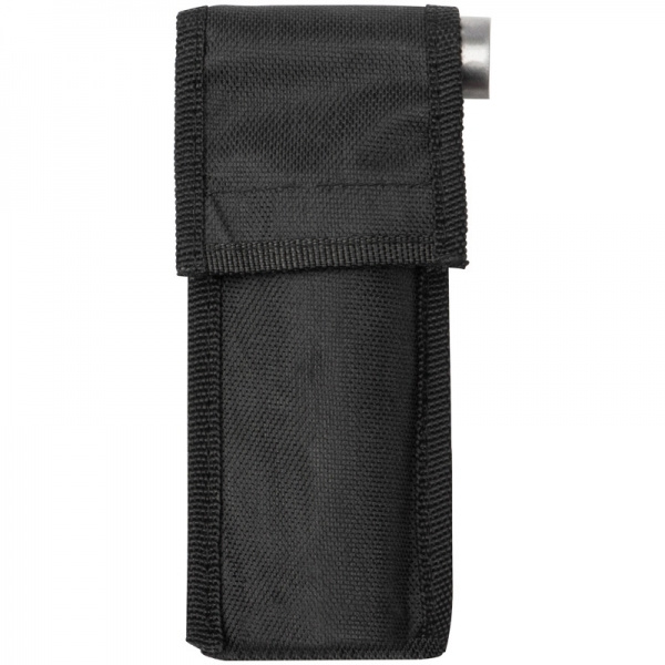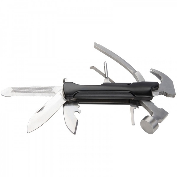 Multifunction tool (stainless steel) consisting of a hammer, a file, two blades, a saw, a slotted screwdriver and a bottle opener. Included is a matching case on which we print your logo in the center.