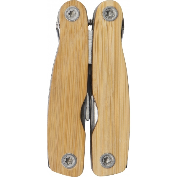 Multifunction tool made of stainless steel with bamboo shells and various tools such as pliers, knife, saw, screwdriver, file, etc. Your logo will be engraved on one side of the handle.