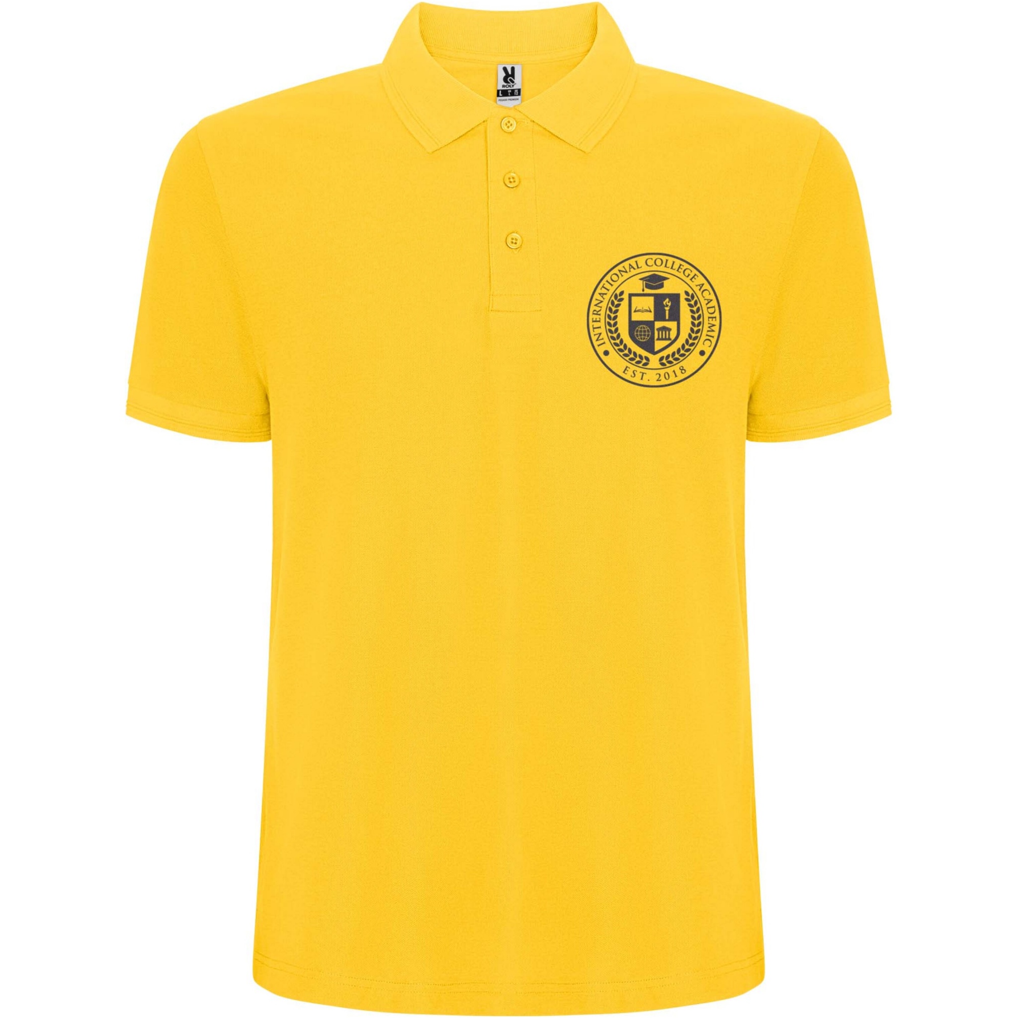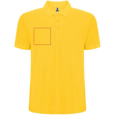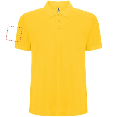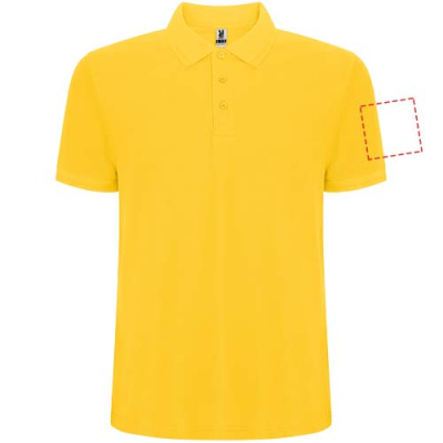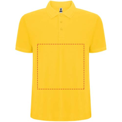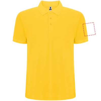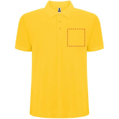 Short-sleeve polo shirt. Collar and sleeves edging in 1x1 ribbed fabric with detail. 3-button placket. Reinforced covered seams in collar. Side slits and optional pocket. Removable label. Anti-pilling treatment.