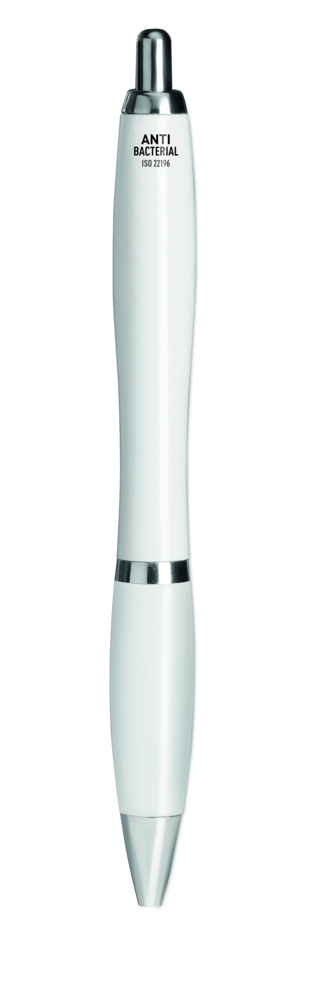 Push button ball pen in ABS with antibacterial barrel. Contains a special additive ( nano silver) that prevent bacteria from colonizing the surface of the pen. ISO 22196. Blue ink.