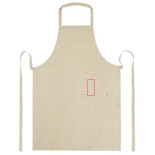 Apron made of 200 g/m² recycled cotton polyester blend. Features 2 adjacent pockets with a combined size of 45 x 20 cm, and a 1 metre tie back closure. Recycled cotton is manufactured from pre-consumer waste generated by textile factories during the cutting process. Due to the nature of recycled cotton, there may be a very slight colour variation. This feature distinctly adds to a more authentic appearance. Length of the neck strap: 55 cm.