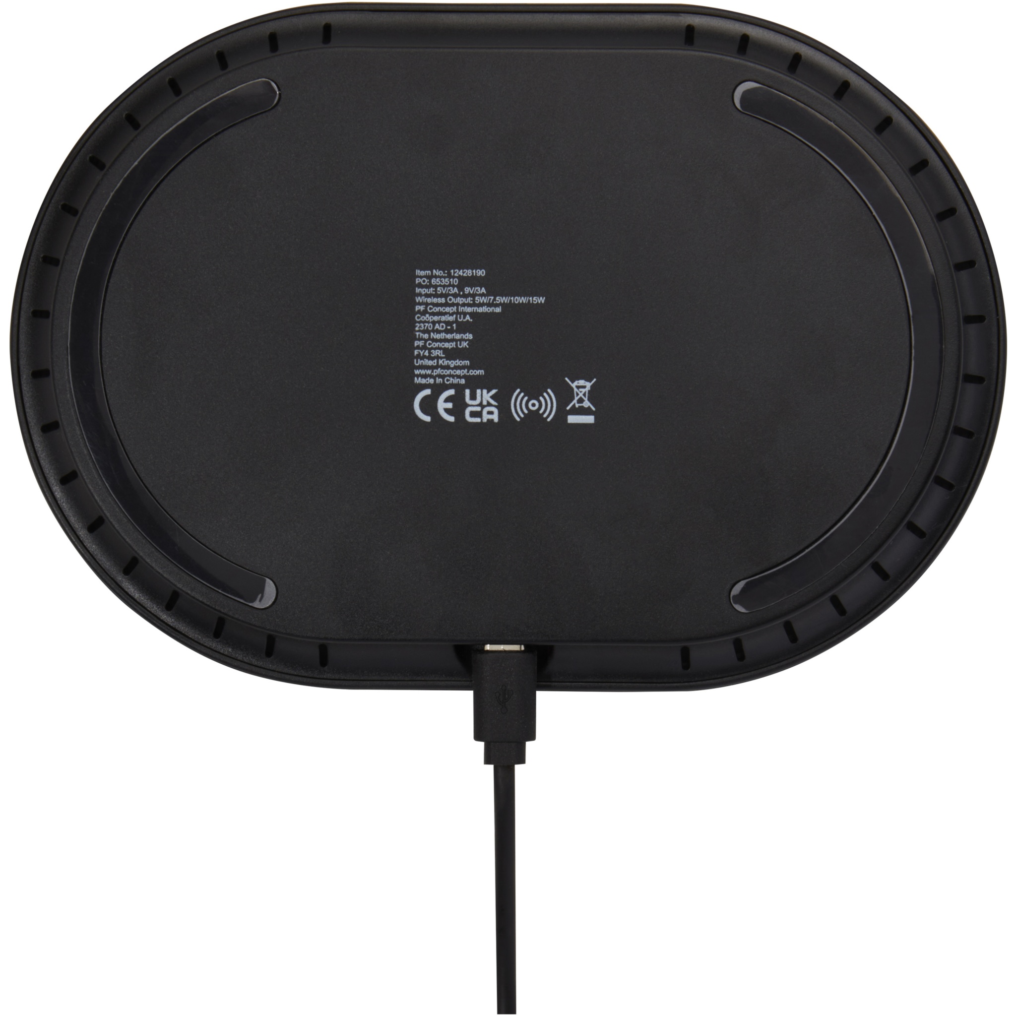 Fast charging wireless charging pad with RBG mood light effect and anti-slip mat. Wireless output is up to 15W, meaning that it's almost 3 times faster than conventional 5W wireless chargers. Built-in Foreign Object Detection (FOD) safety feature to avoid risk of fire. Compatible with all Qi enabled devices (iPhone 8 or above and Android devices that support wireless charging). Input power: 5V/2A, 9V/2.67A. Output power: 5W/7.5W/10W/15W. LED light: 6 x 5050 LED, 1000 mcd. Includes a 100 cm TPE USB A to Type C 3A PD charging cable. Delivered in a standard gift box