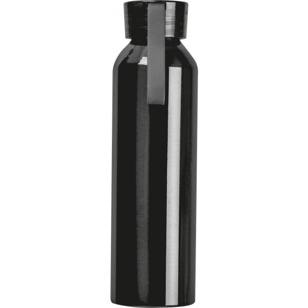 Water bottle made of recycled aluminum with a plastic lid, a silicone carrying strap, and a capacity of 600 ml. Eco-friendly and practical for on-the-go use.