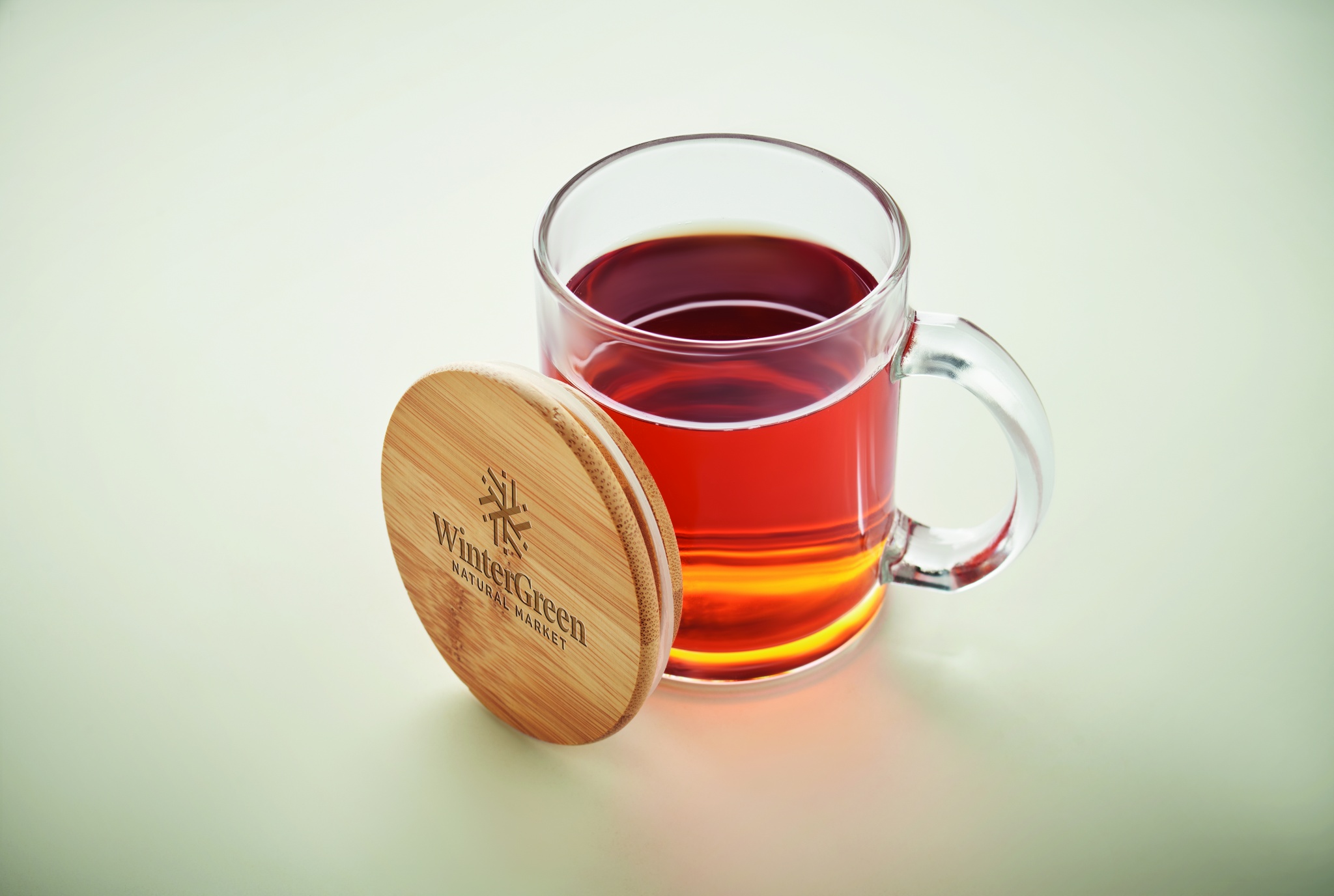 Recycled glass mug with bamboo lid. Capacity: 300 ml. Bamboo is a natural product, there may be slight variations in colour and size per item, which can affect the final decoration outcome.