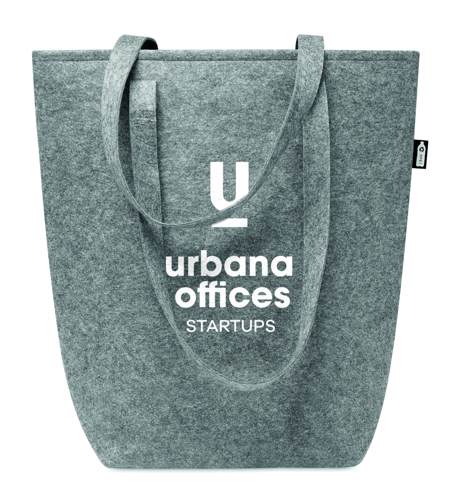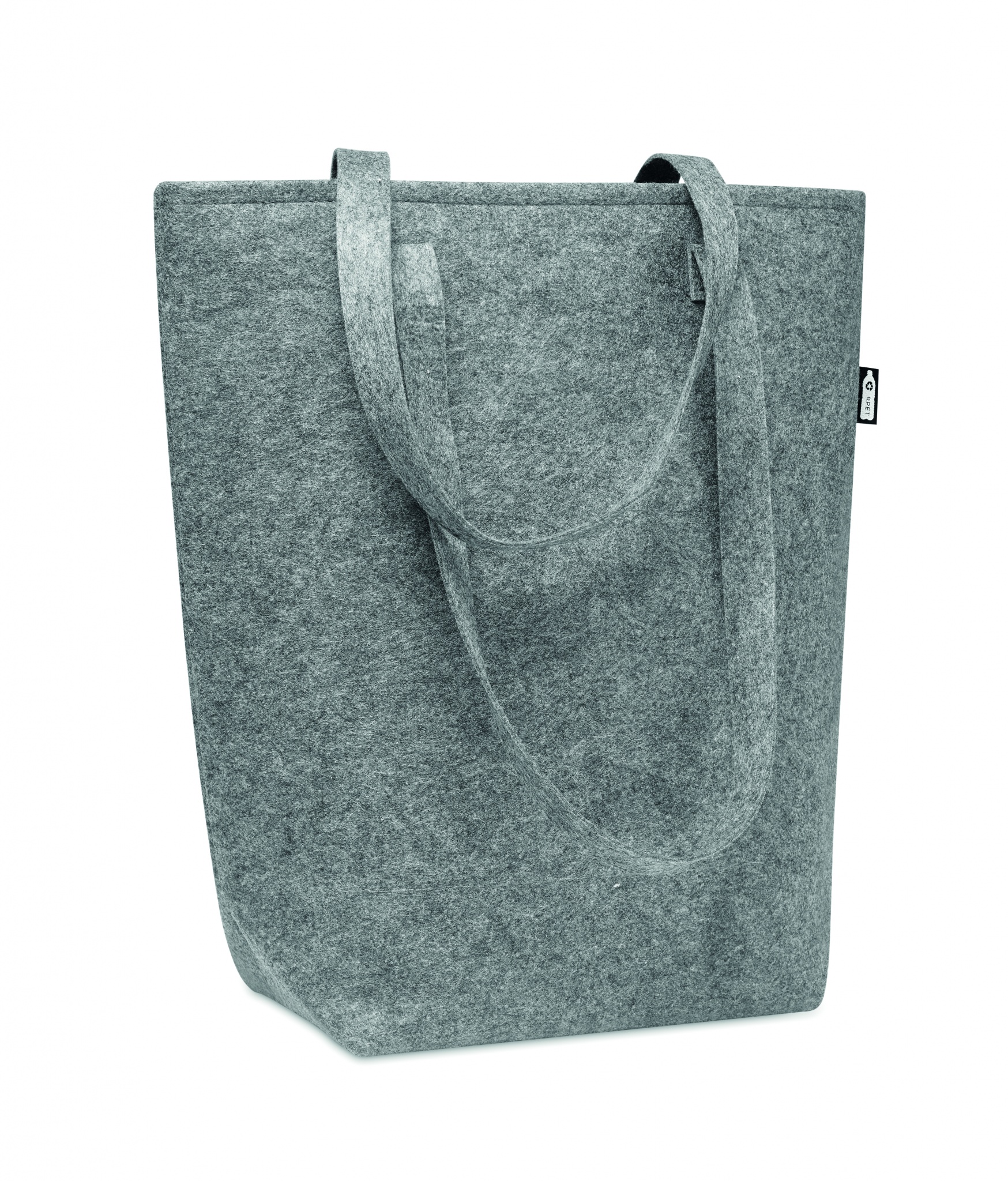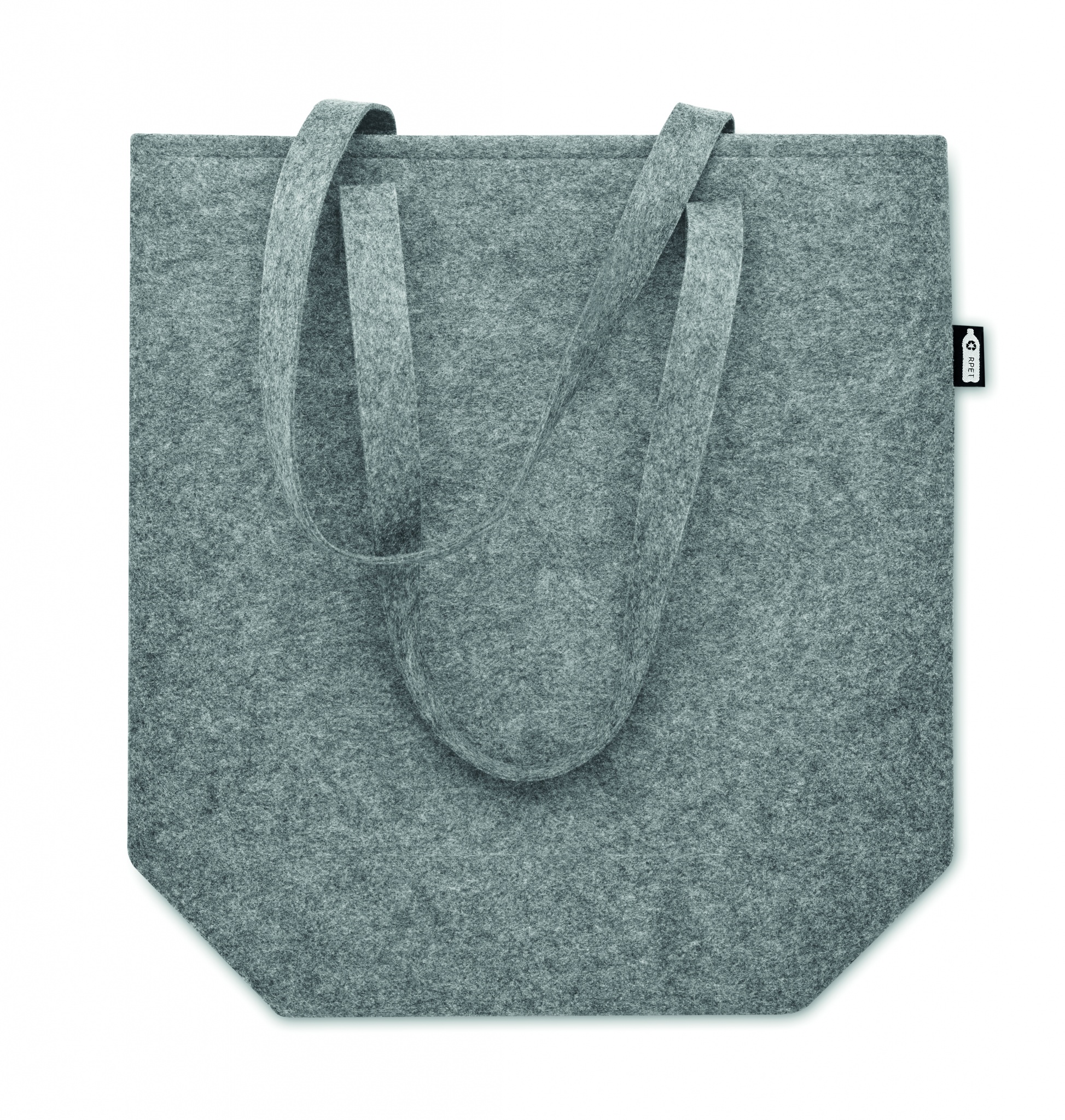 RPET felt shopping bag with long handles and bottom gussets. Felt thickness: 2 mm.
