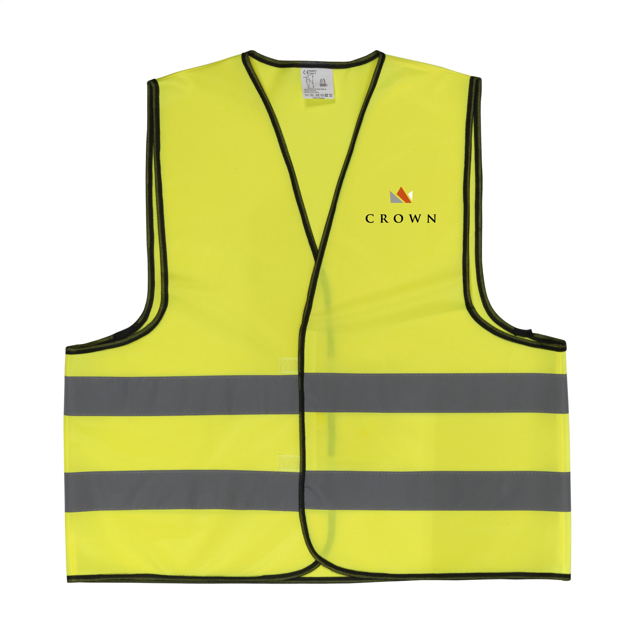 Fluorescent safety vest made from 100% tricot polyester. One size fits all, with adjustable velcro fastener. (EN-20471 Class 2). Each piece in a pouch.
