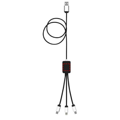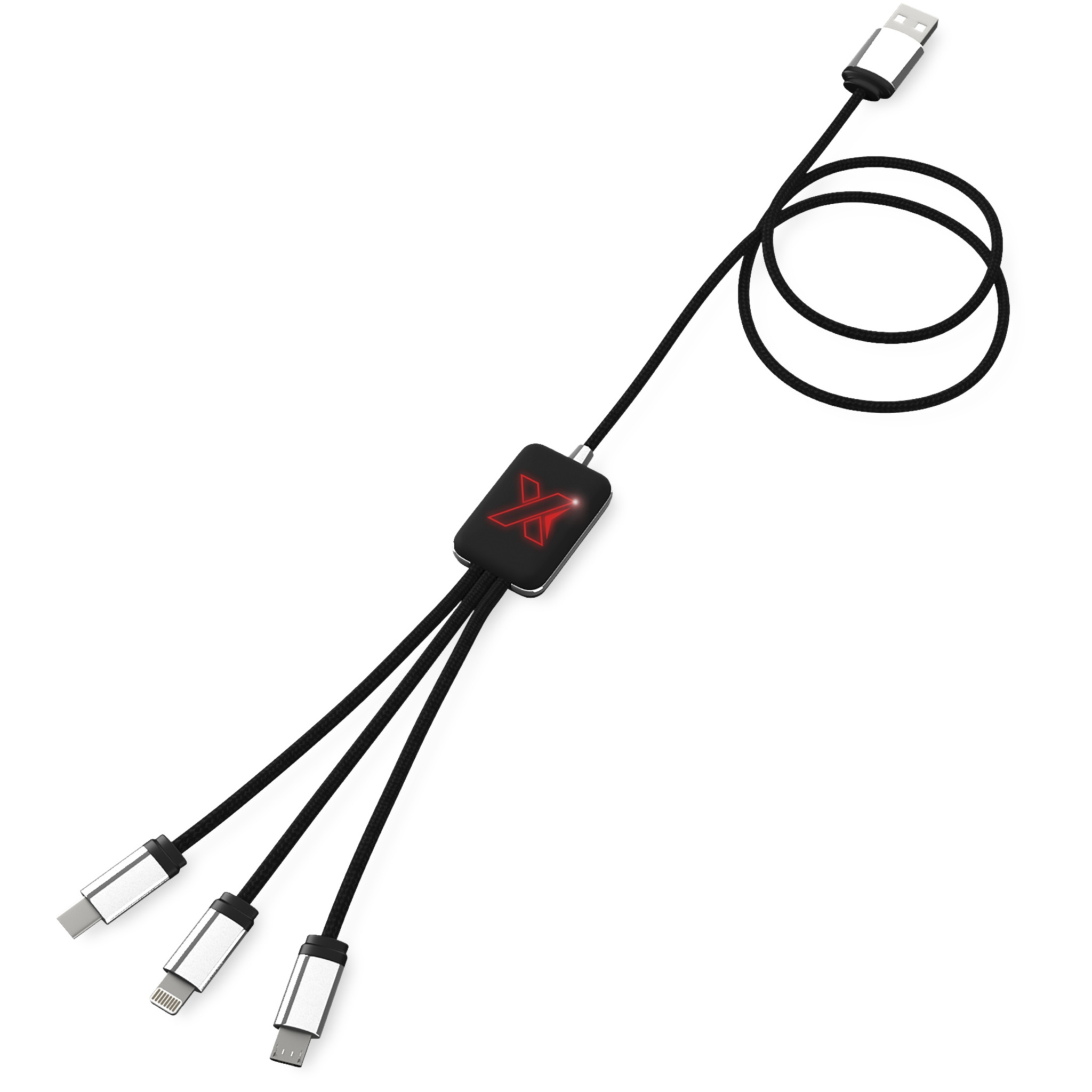 Light-up logo charging cable with rubber and metal finish fitted with three connectors (Type-C, Android, iPhone). Up to three devices can be charged simultaneously. Length of cables (including plugs): 10 cm. Total cable length: 1 metre. Recycled PET plastic cable and packaging is made of recycled paper and recycled plastic.