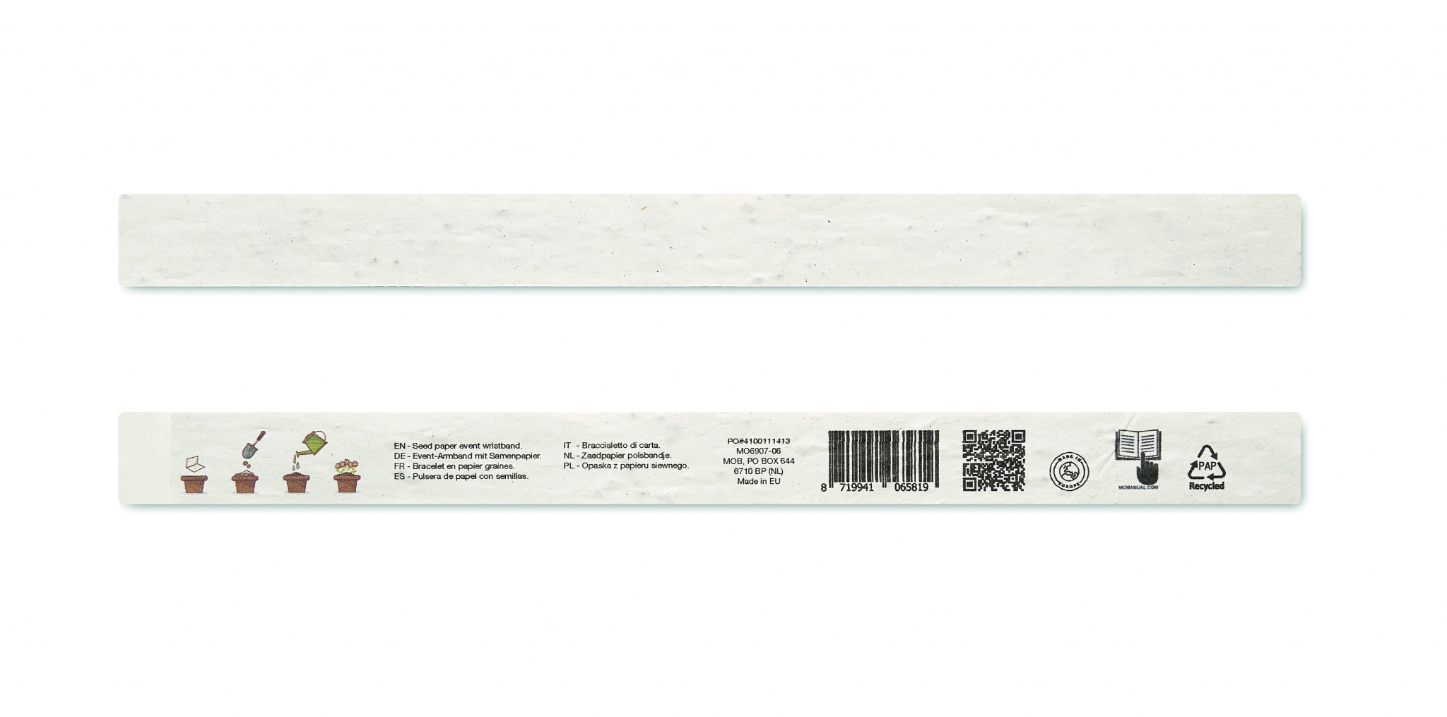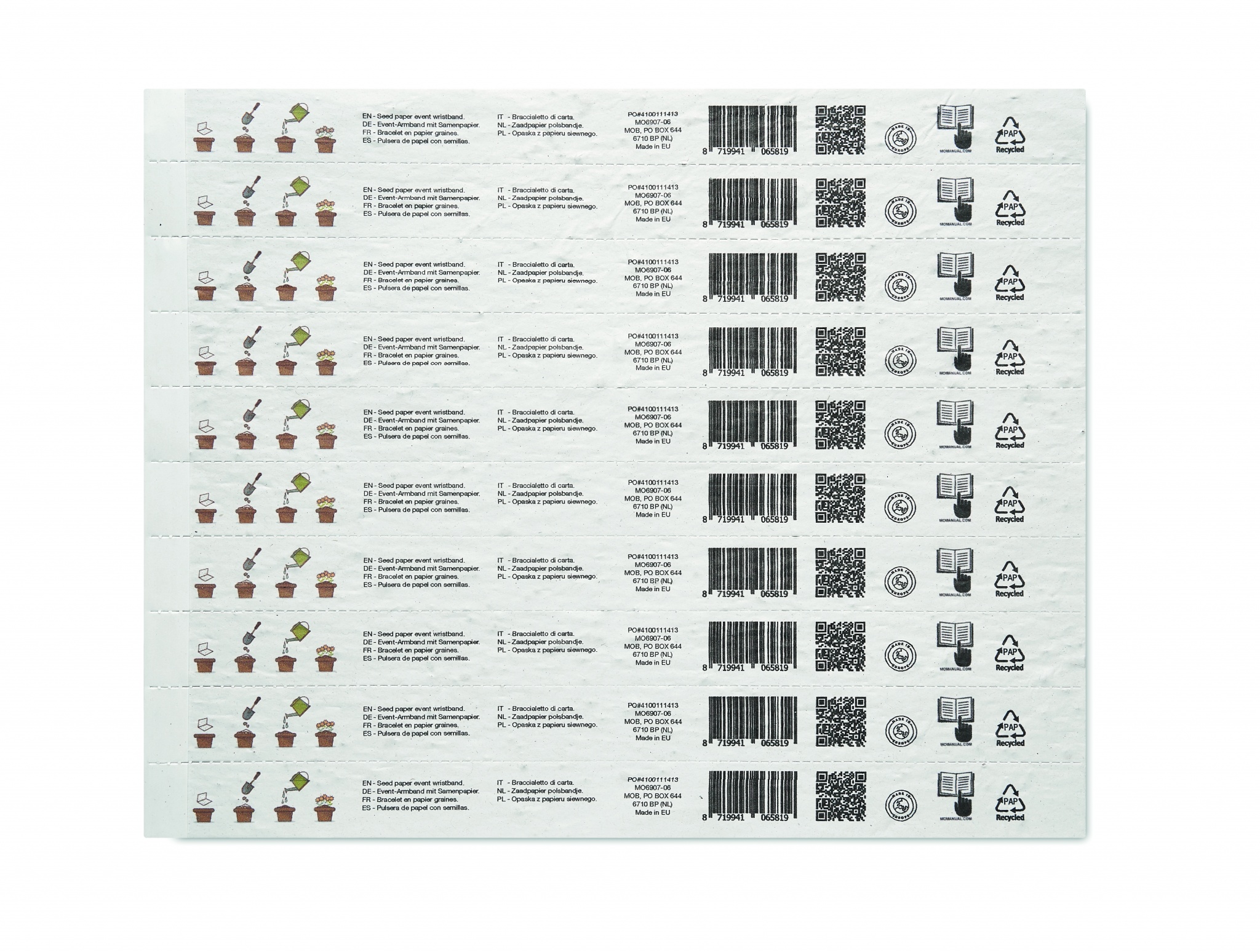 One sheet of 10 event wristbands. Wildflower seeds recycled paper. 19mm wide. Made in EU.