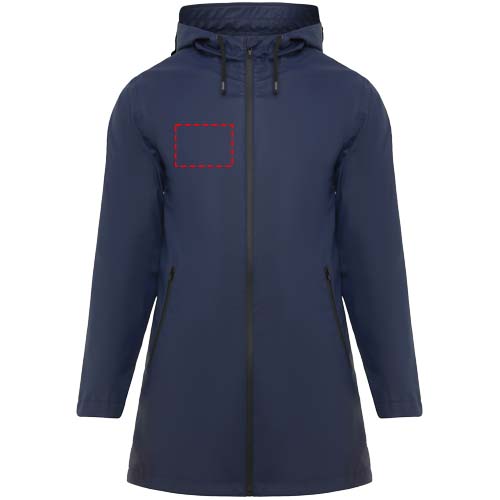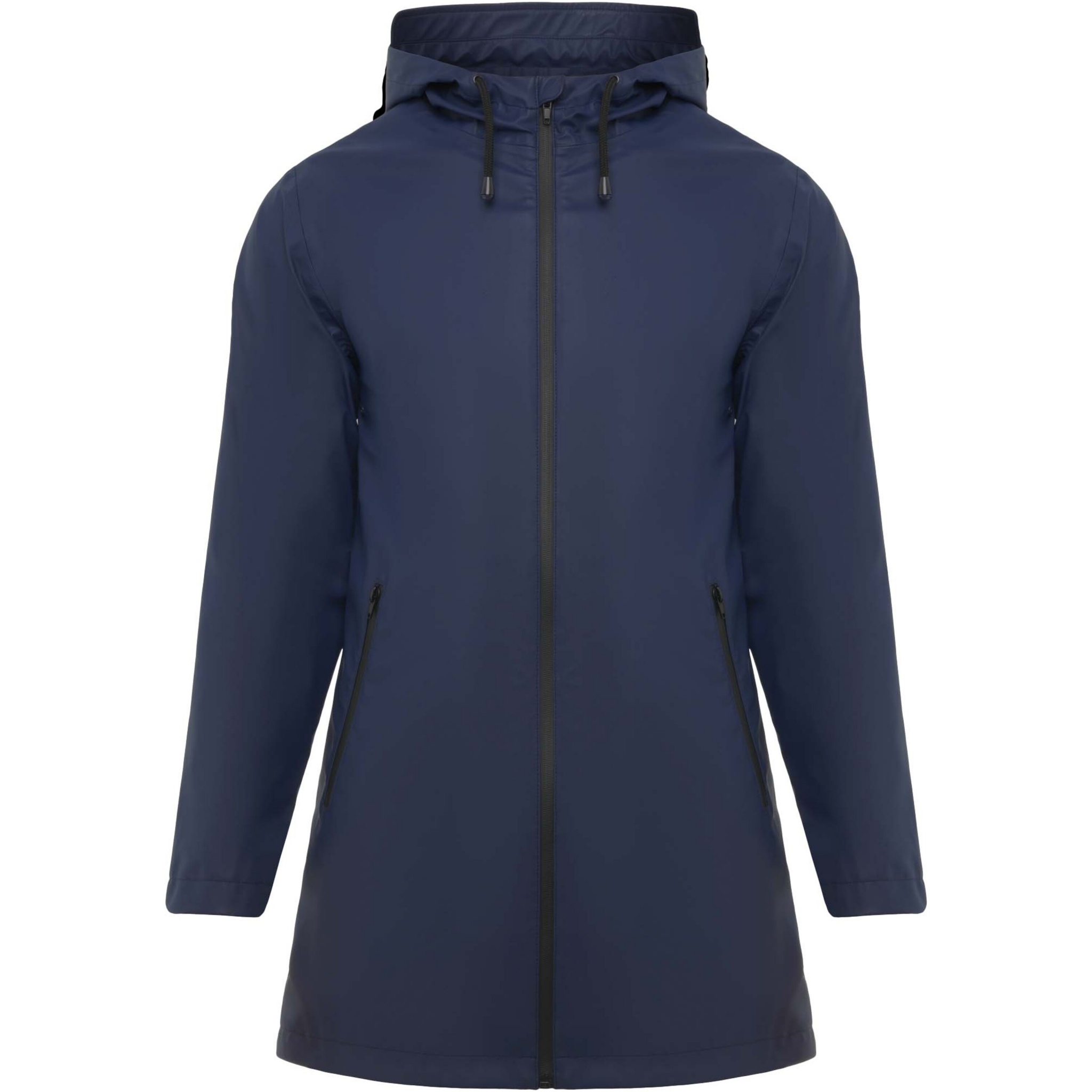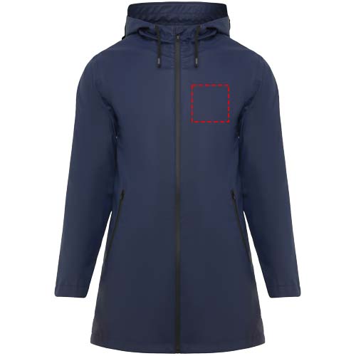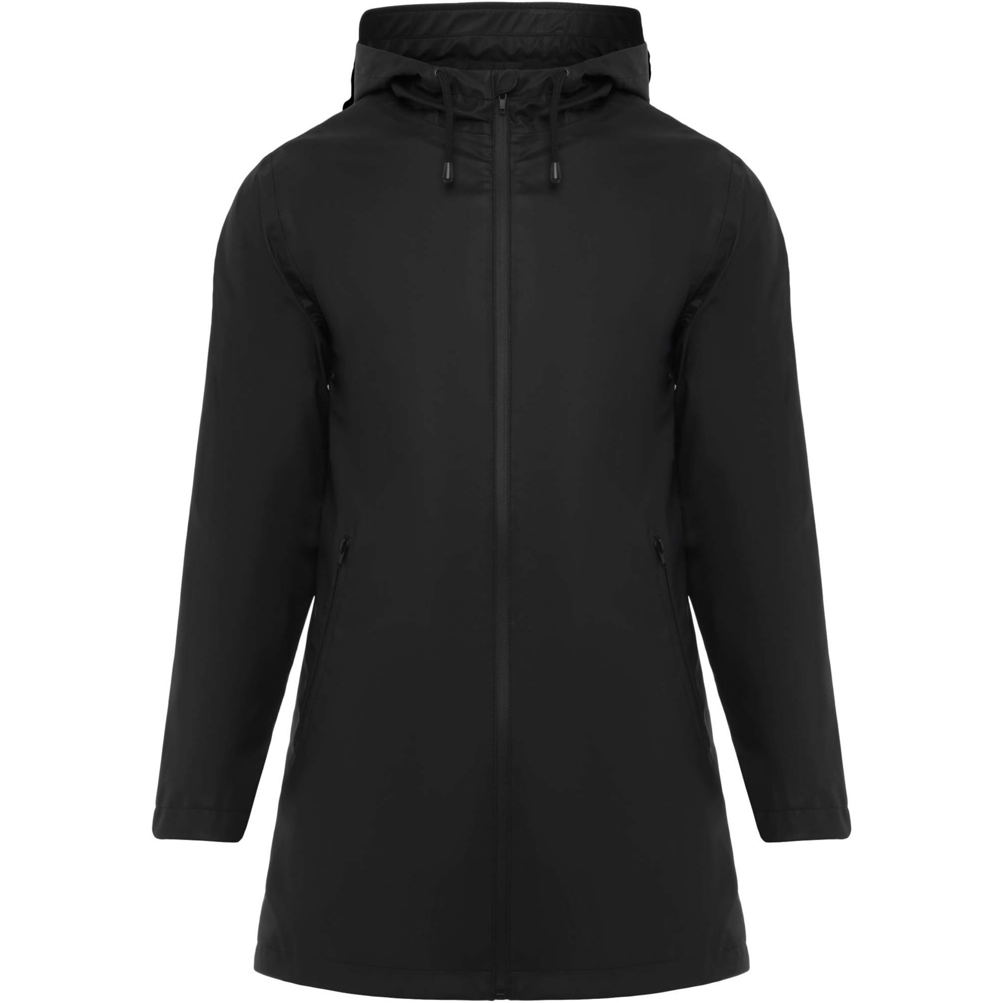 Waterproof raincoat for women. Hood with peak. Heat-sealed zips and seams. Contrasting details in black. Two side pockets with zip. Slit on back hem. Removable label. Waterproof. The model is 179 cm and is wearing size S.