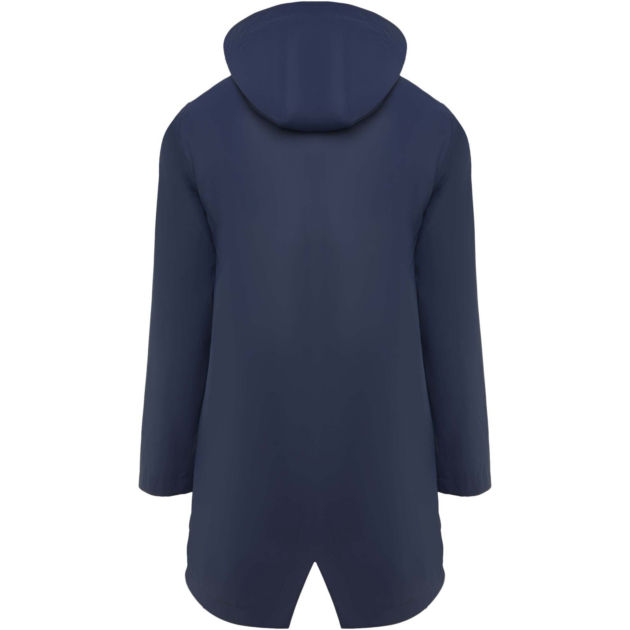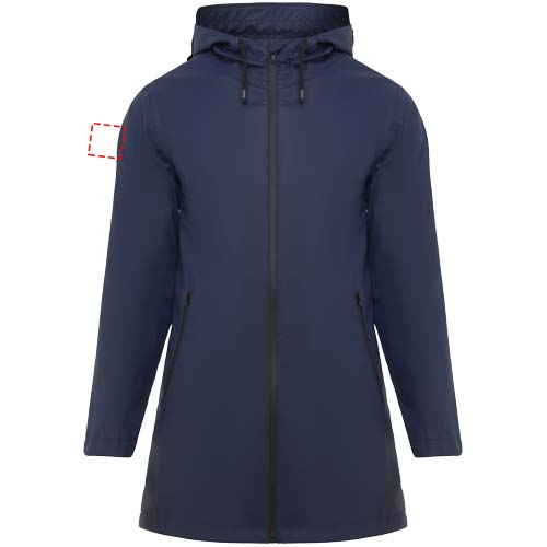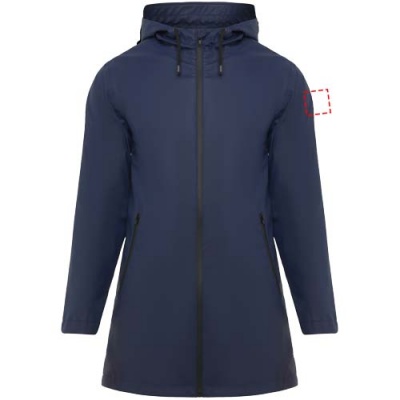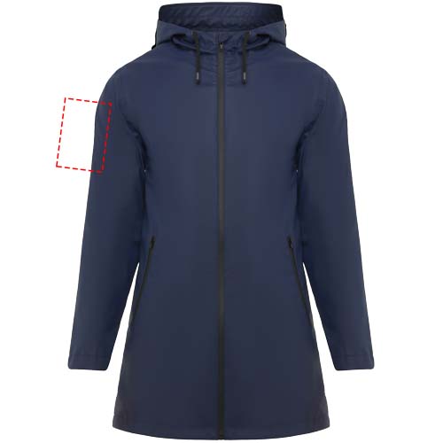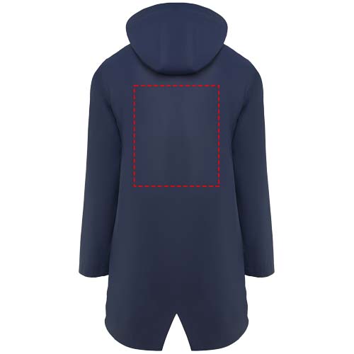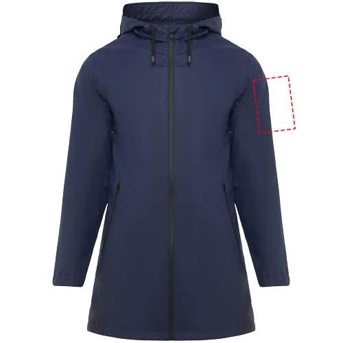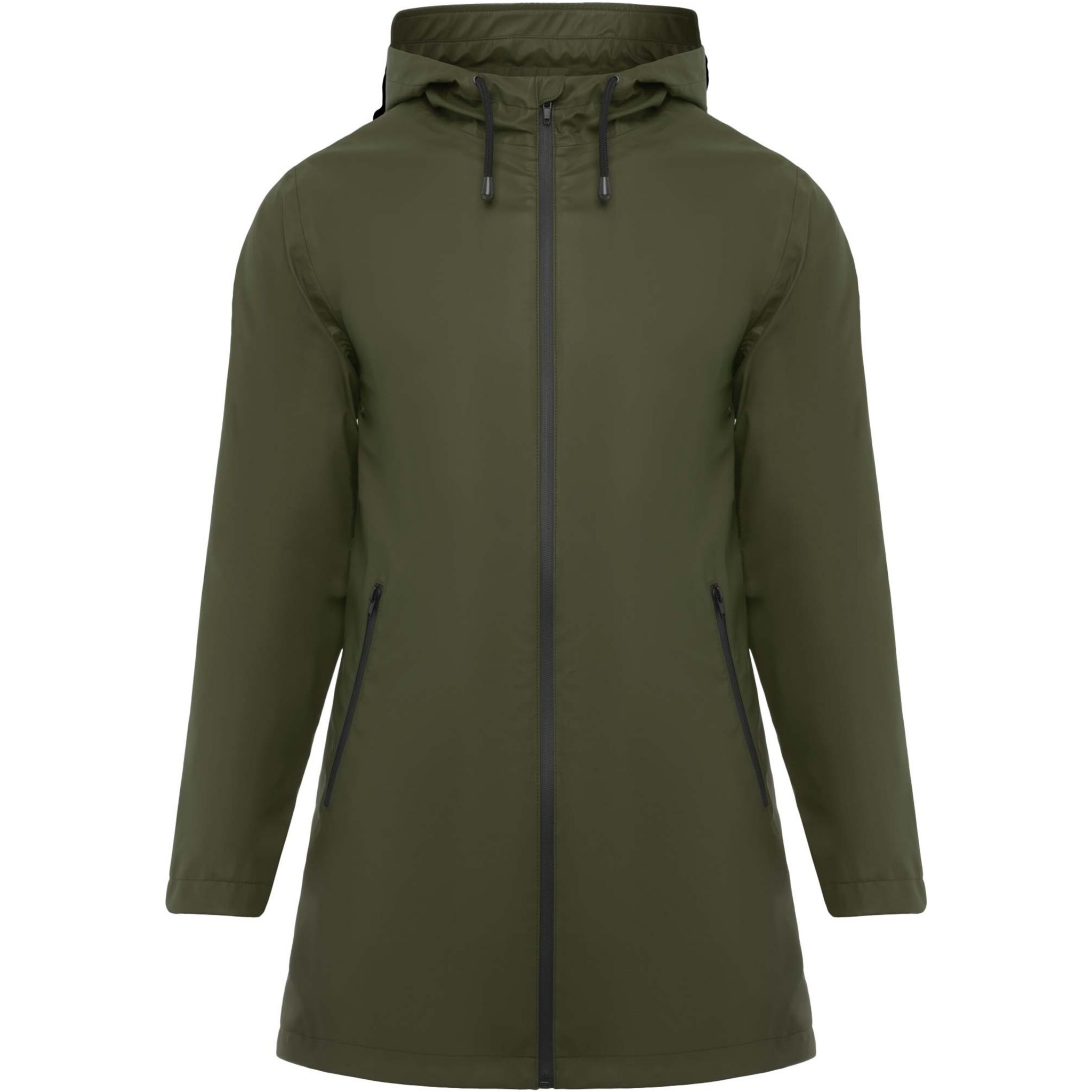 Waterproof raincoat for women. Hood with peak. Heat-sealed zips and seams. Contrasting details in black. Two side pockets with zip. Slit on back hem. Removable label. Waterproof. The model is 179 cm and is wearing size S.