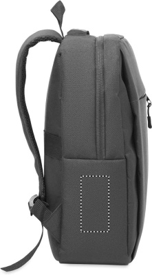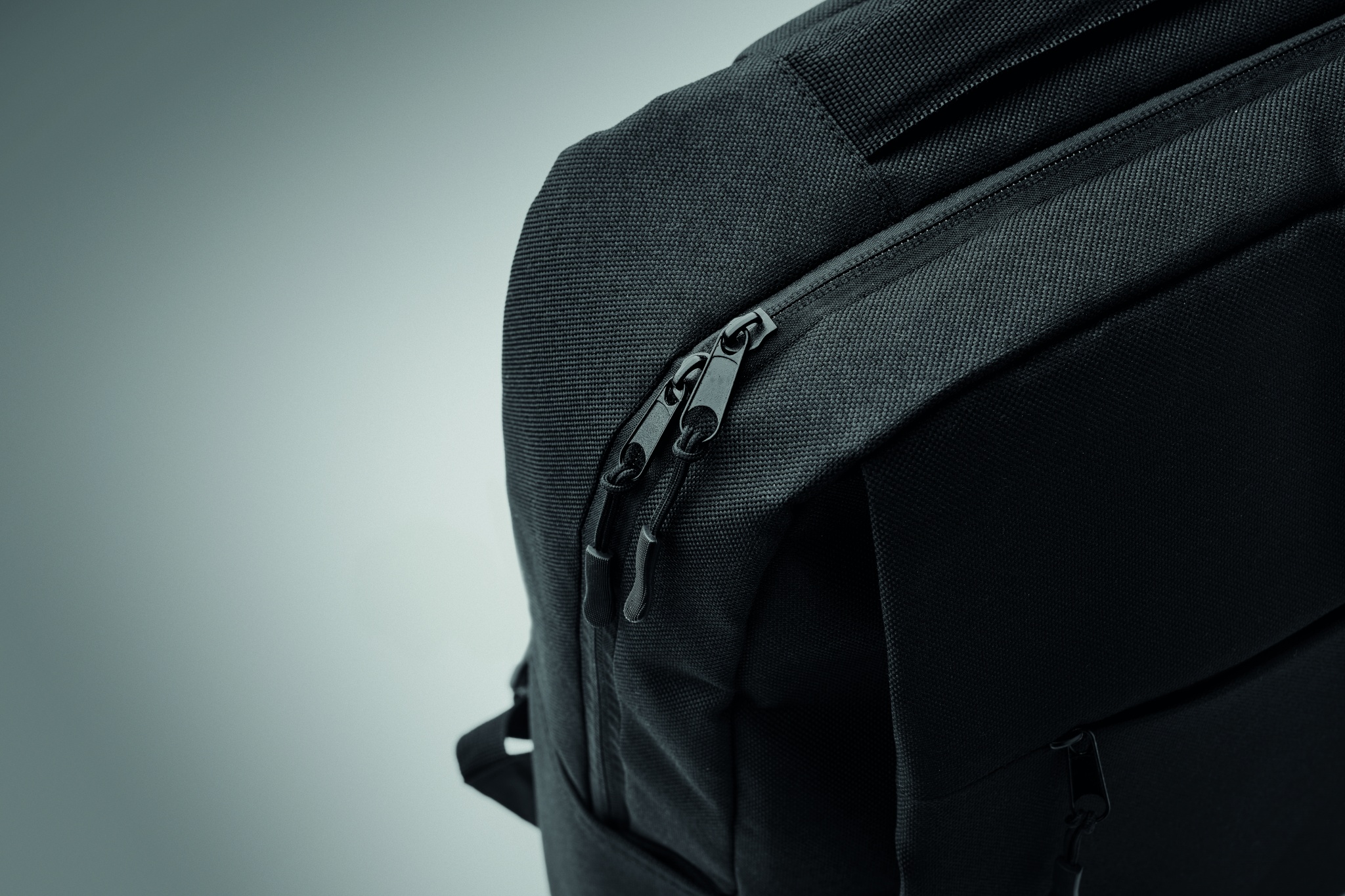Slim backpack in 600D RPET polyester and 210D lining. Has 15 inch laptop compartment, a 10 inch tablet outside zippered pocket, 2 internal pockets, 2 internal pen pockets, zippered front pocket. 2 side pockets. Soft padded back and shoulder straps. Suitcase sleeve.