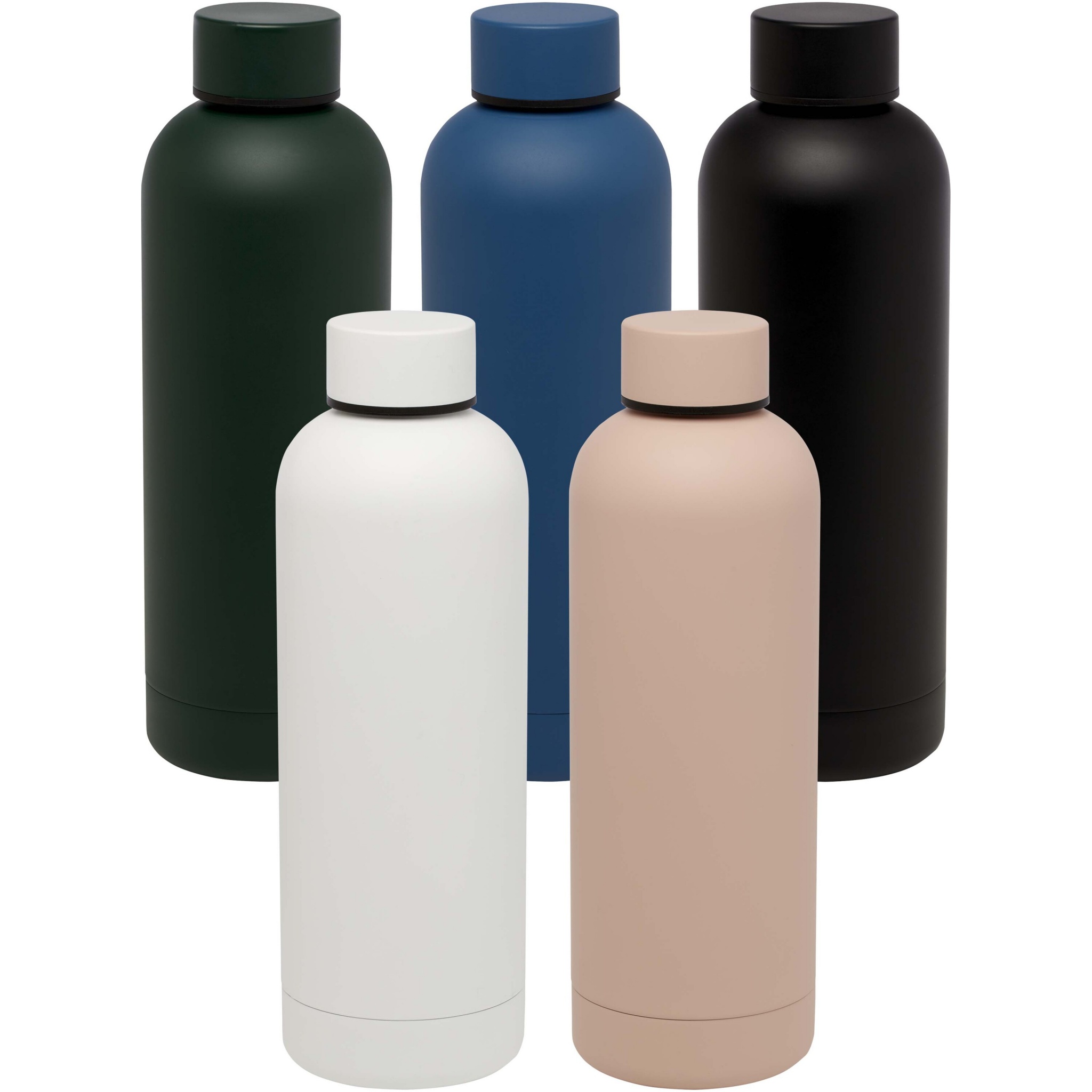 Copper vacuum insulated RCS certified stainless steel bottle with clean design. The insulated stainless steel construction prevents condensation on the inside of the bottle, and the on-trend matte powder-spray finish makes it extra durable. BPA-free, tested and approved under German Food Safe Legislation (LFGB). Tested and approved for phthalates content according to REACH regulations. Volume capacity is 500 ml. Hand wash recommended. Presented in a recycled cardboard gift box.