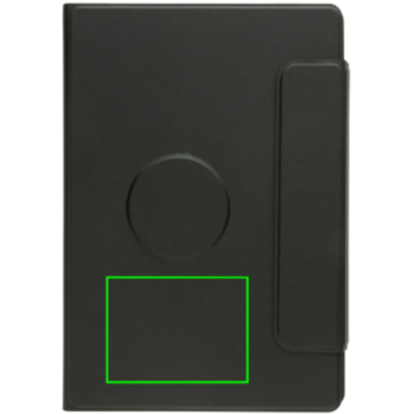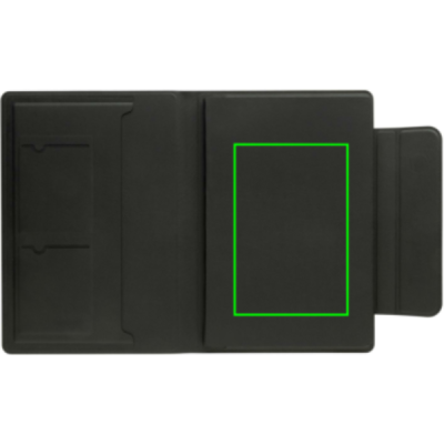 A5 portfolio, recycled polyester PU with magnetic closure and magnetic phone holder that is compatible with magsafe iPhones 12 or higher, inside A5 notebook with lines, innerp ages are FSC® certified and 64 sheets/128 pages; cream paper colour with lines; paper weight 80gsm, documents pocket and 2 business card slots. Notebook is refillable.