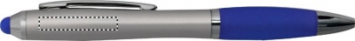 Twist action ball pen in ABS with stylus soft grip and matching tip. Blue ink