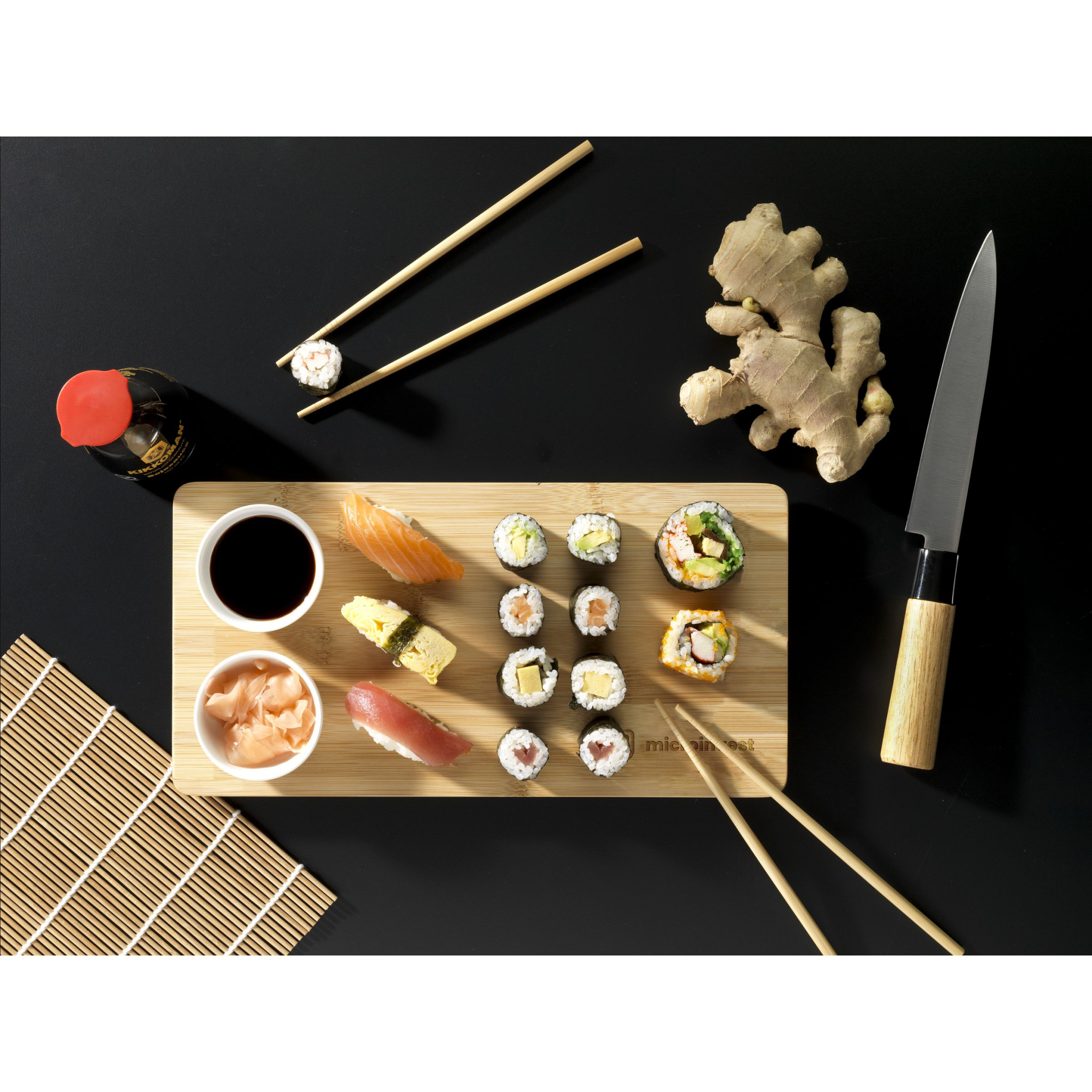 WoW! Complete sushi serving set consisting of: bamboo sushi serving board on legs, 2 sets of bamboo chopsticks and 2 ceramic bowls (Ø 7 cm). With this set, you can serve sushi in style. Bamboo is durable, hygienic, antibacterial and easy to clean. Items supplied as a set in a brown cardboard box.