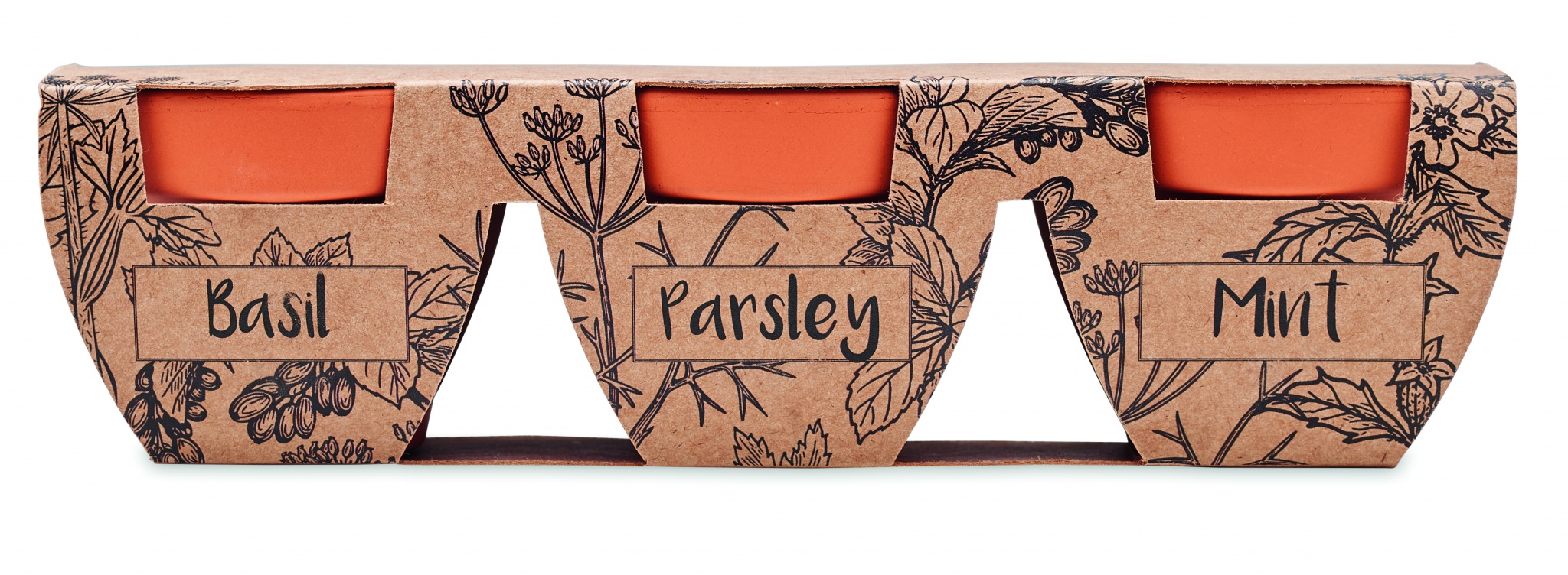 Set of 3 clay terracotta pots including 3 different seeds of 3 different herbs: mint, parsley and basil. Made in EU.