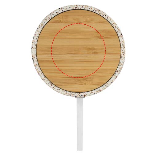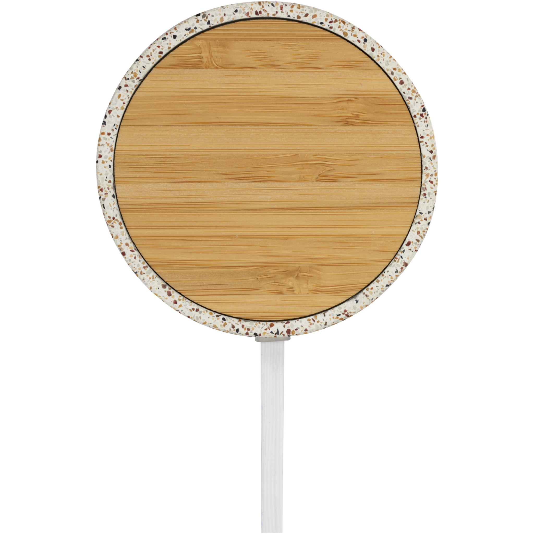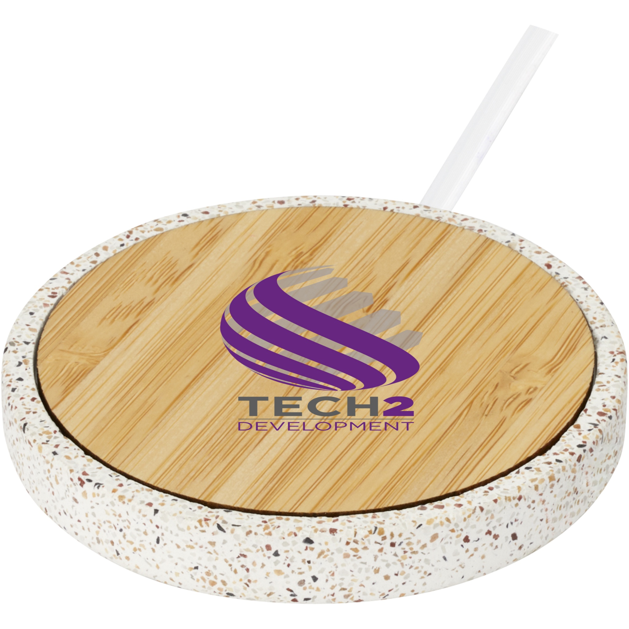 10W wireless charging pad made of a combination of natural terrazzo and bamboo. Built-in FOD safety feature to avoid risk of fire. Compatible with all Qi enabled devices (iPhone 8 or above and Android devices that support wireless charging). Delivered in a gift box with an instruction manual (both made of sustainable material).