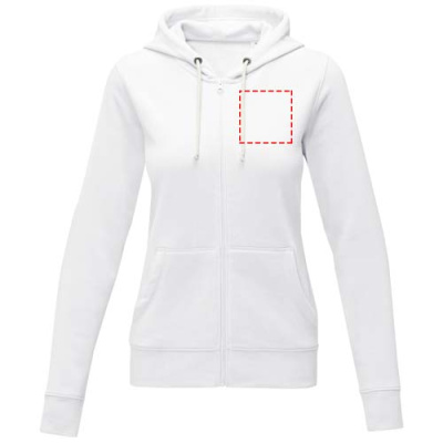 The Theron women's full zip hoodie – where style meets comfort in perfect harmony. This hoodie is a true embodiment of classic design. Additionally, the interior custom branding options allow personalised branding or customisation inside the hoodie. A kangaroo pocket combines convenience with a modern aesthetic. The flat knit rib bottom hem and cuffs guarantee a secure fit, while the brushed interior maximizes softness. The 240 g/m² fabric, blend of cotton and polyester, promises warmth and durability. Elevate your wardrobe with the Theron full zip hoodie. This hoodie is designed with a fitted shape for a feminine look.
