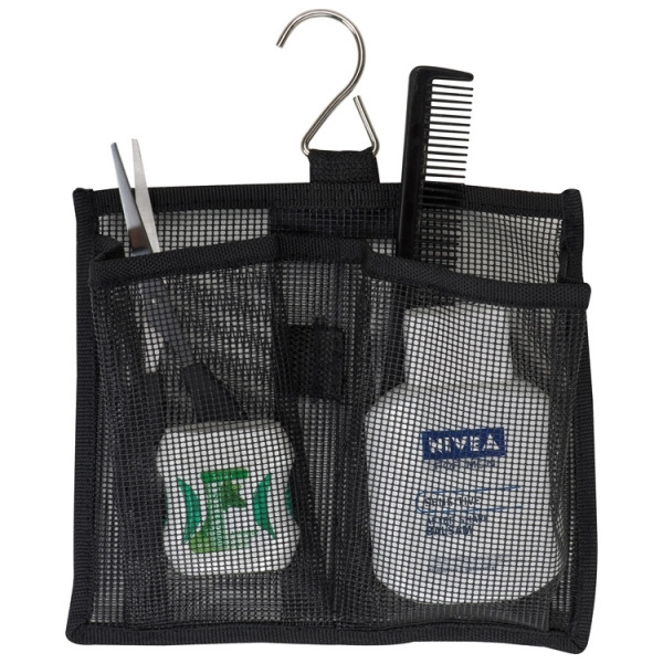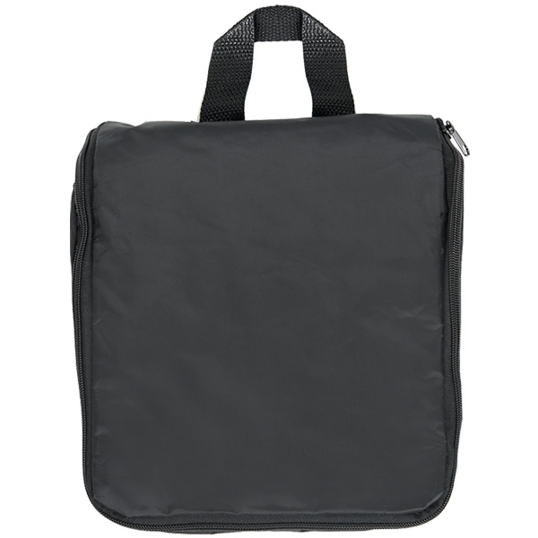 Our toilet bag recommendation! This is the right one! Made of robust nylon - inside with ample space, there is a transparent zipper compartment, a stretch band with 5 loops, 3 big net compartments and 2 net compartments with a metal hook, which you can take out by means of a Velcro fastener, for hanging up in the shower for e.g. shampoo or shower gel. The bag provides a 270 degrees surround zipper and one further metal hook for hanging it up. This is practical and convenient! We will print your logo on the front of the bag.