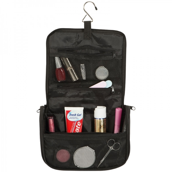 190T nylon toilet bag with a large inner compartment, 3 zipped compartments, 4 elastic bands, and hanging hook. We print your logo on the front.