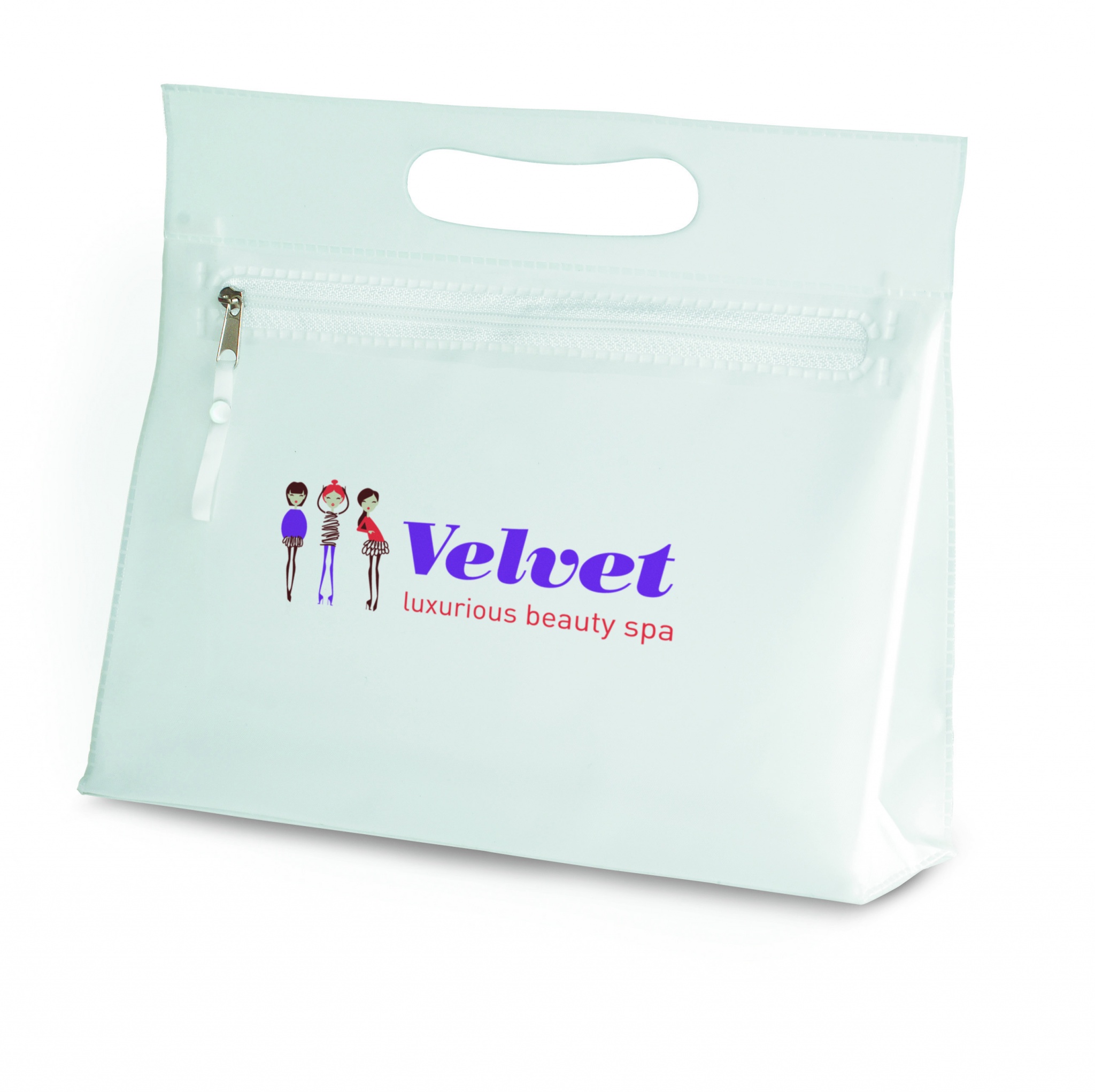 Transparent PVC cosmetic pouch with zipper.
